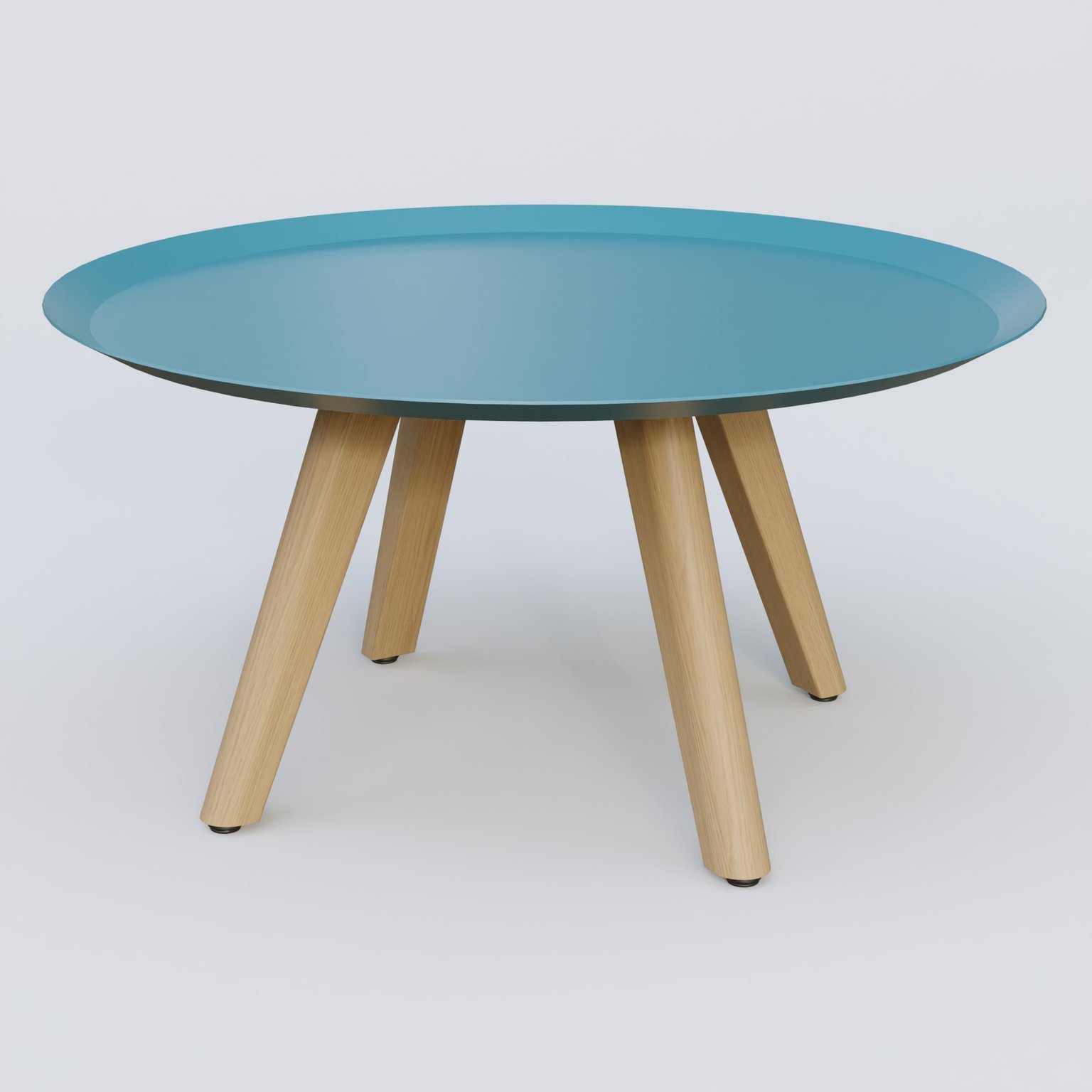 Table Basse Fashion Styl piètement 3 pieds bois et plateau métal. Plateau Bleu Petrole (RAL 5025) et pietement Chêne.