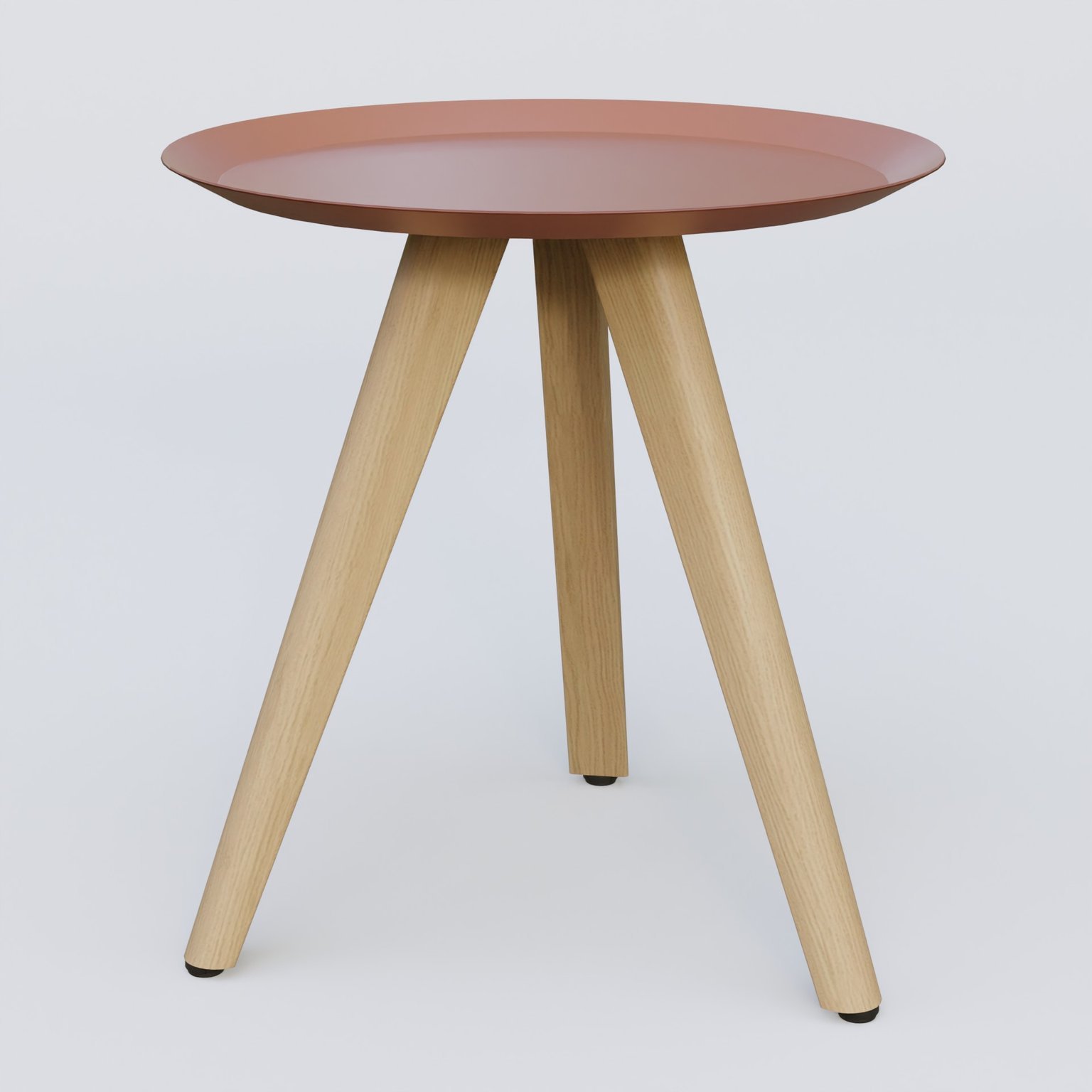 Table Basse Fashion Styl piètement 3 pieds bois et plateau métal. Plateau Brun cuivré (RAL 8004) et pietement Chêne.