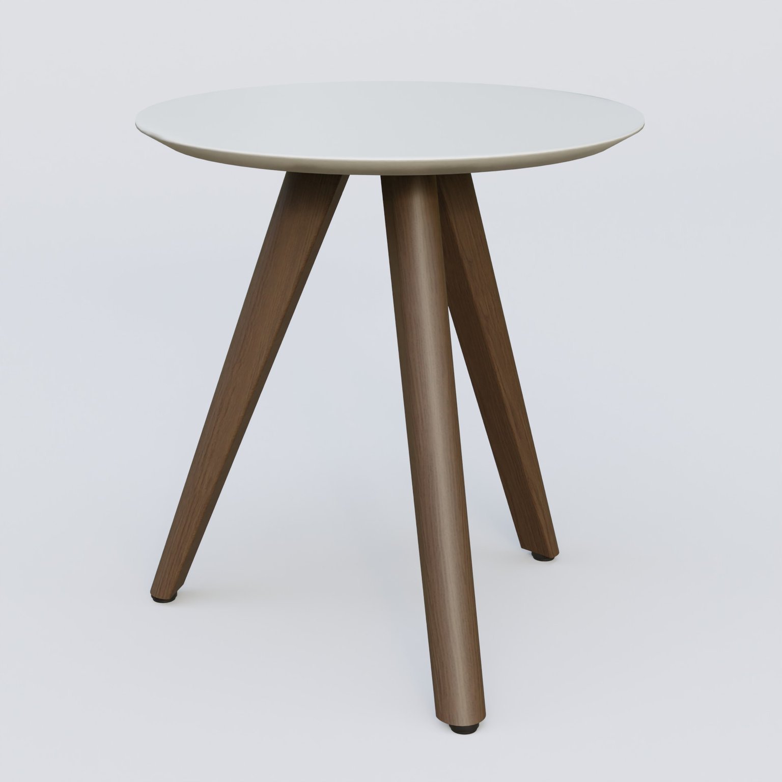 Table Basse Fashion Styl piètement 3 pieds en bois et plateau bois. Plateau Blanc (RAL 9010) et pietement Chêne Moka.
