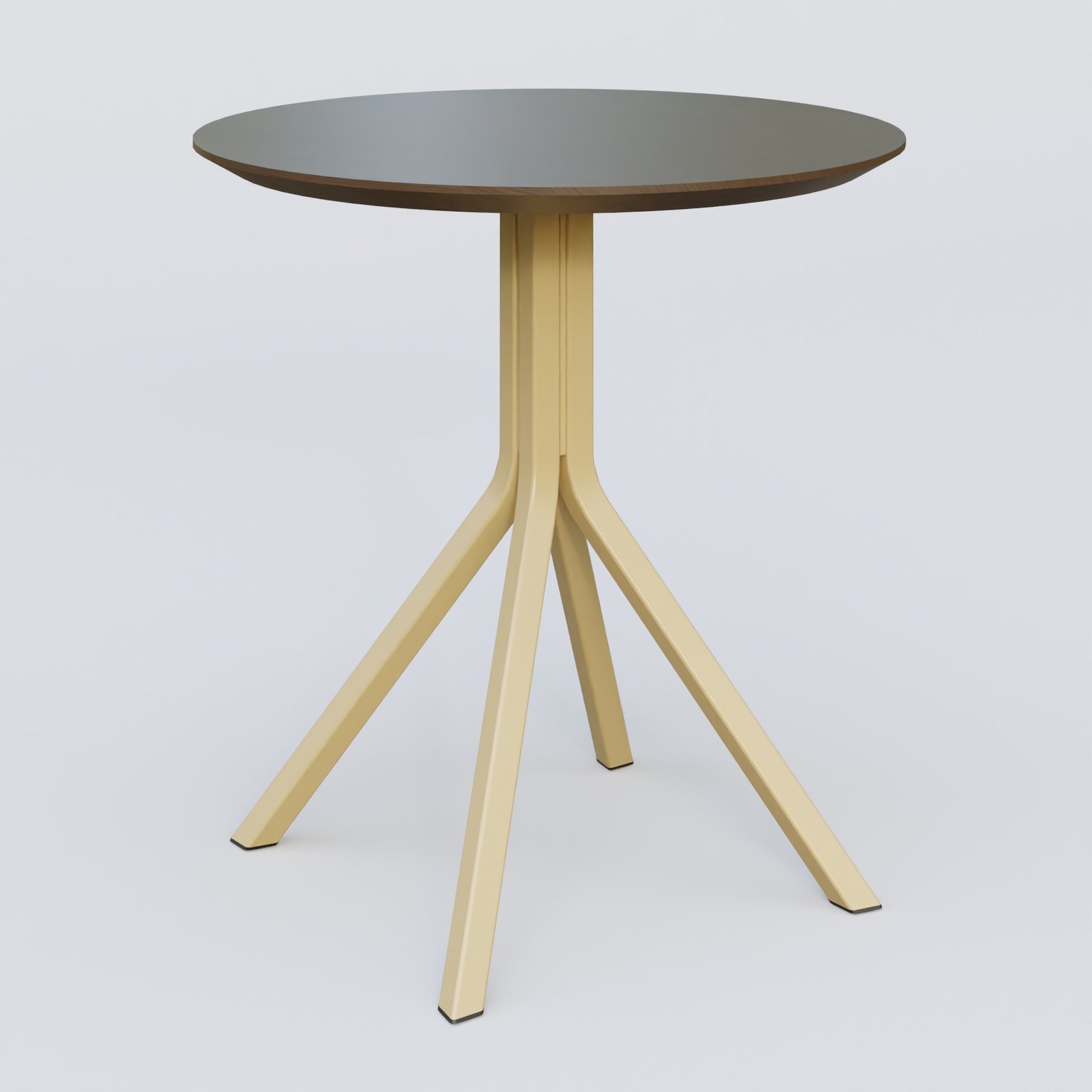 Table Basse Fashion Styl piètement 4 branches en métal et plateau bois. Plateau Chêne Moka et pietement Jaune Cuivre (RAL 1002).