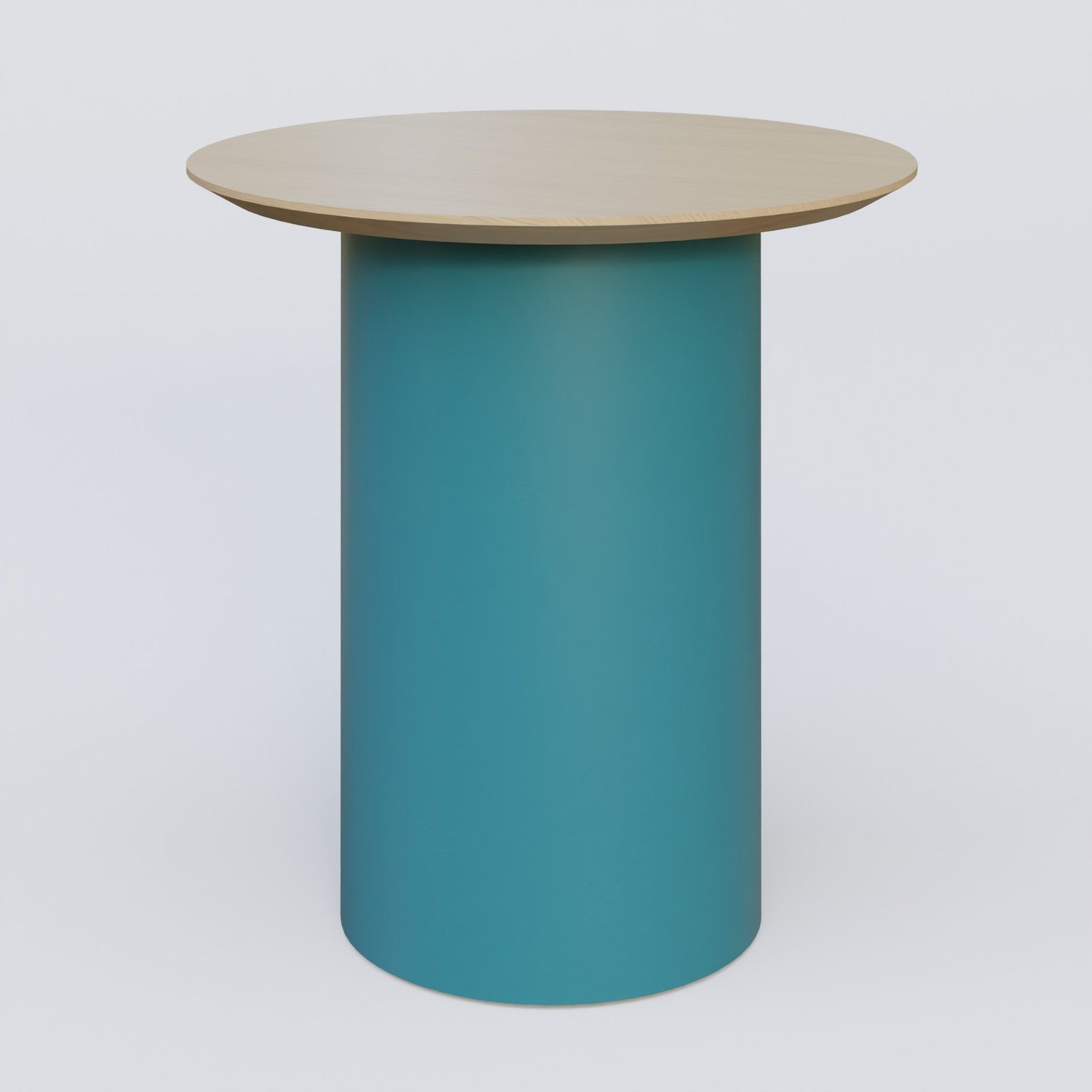 Table Basse Fashion Styl piètement colonne en métal D-26cm et plateau bois. Plateau Chêne et pietement Bleu Petrole (RAL 5025).