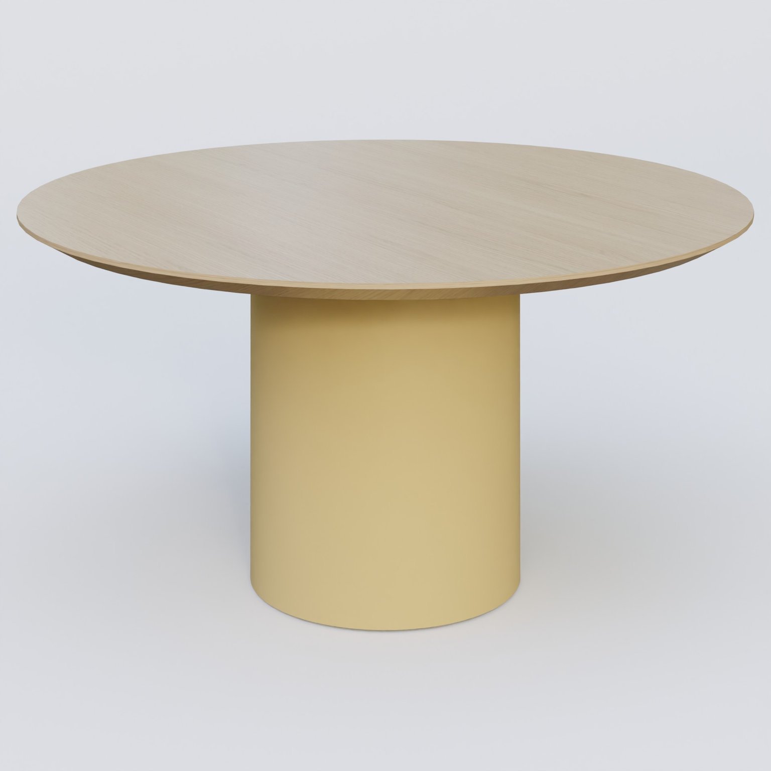 Table Basse Fashion Styl piètement colonne en métal D-26cm et plateau bois. Plateau Chêne et pietement Jaune Cuivre (RAL 1002).