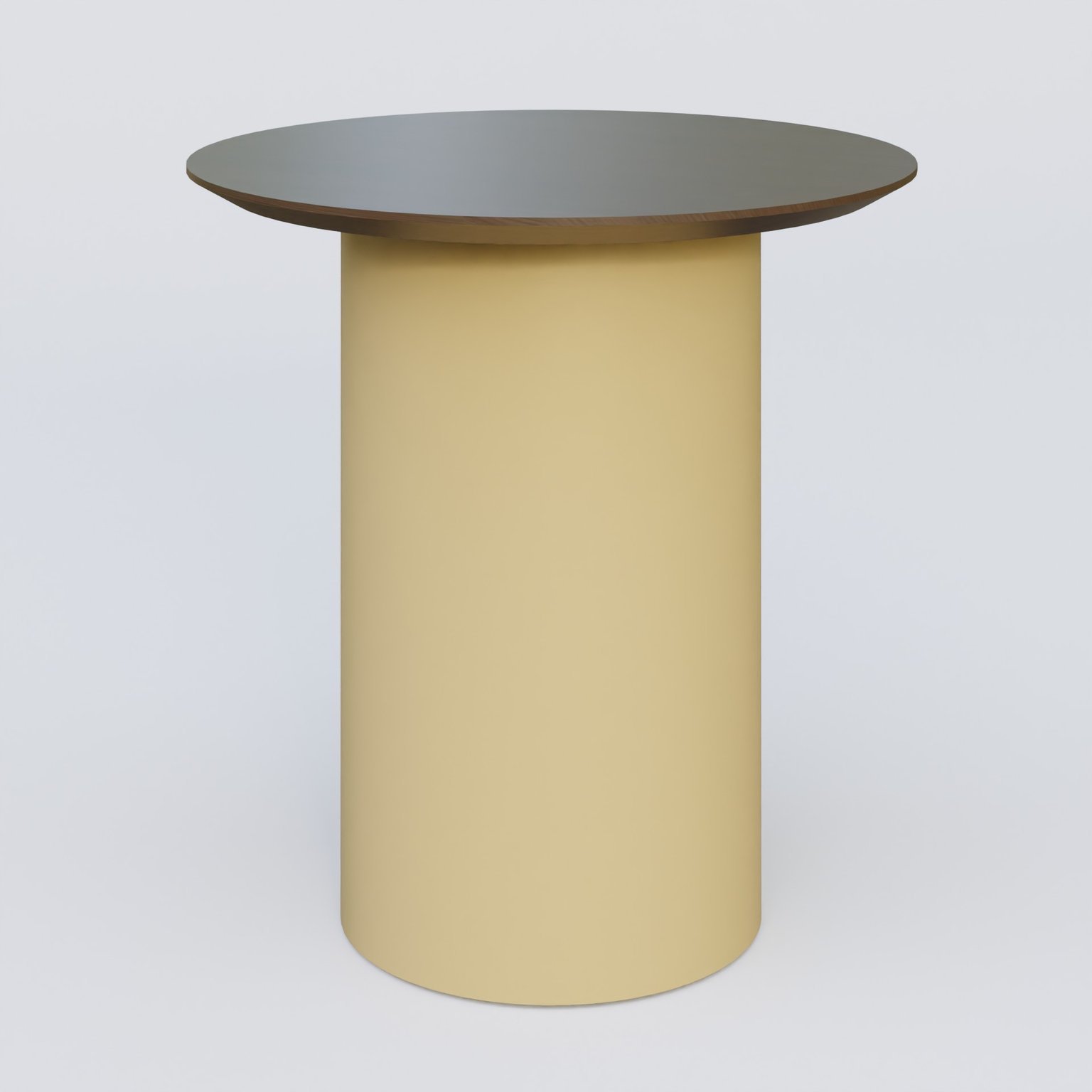 Table Basse Fashion Styl piètement colonne en métal D-26cm et plateau bois. Plateau Chêne Moka et pietement Jaune Cuivre (RAL 1002).