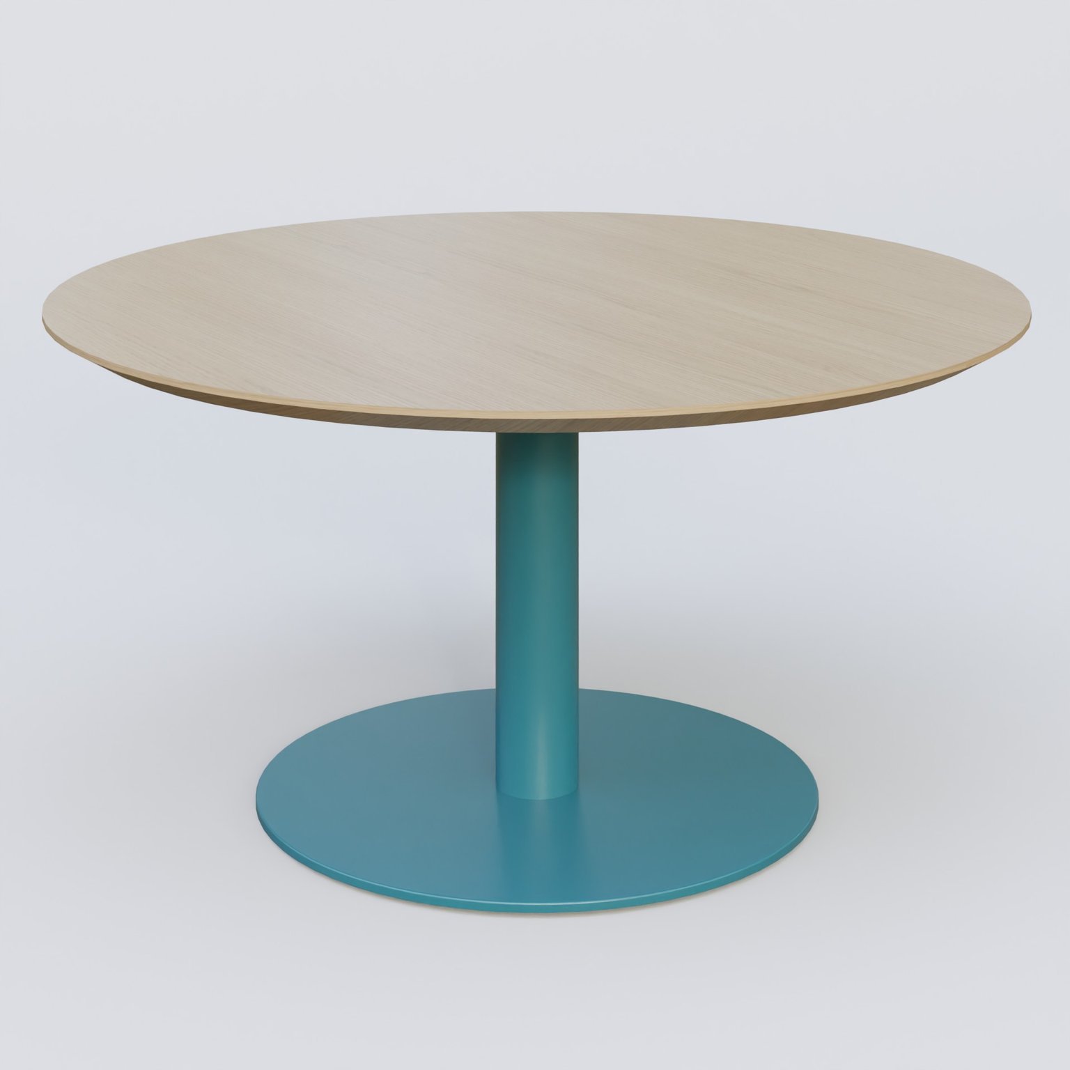 Table Basse Fashion Styl piètement colonne en métal et plateau bois. Plateau Chêne et pietement Bleu Petrole (RAL 5025).