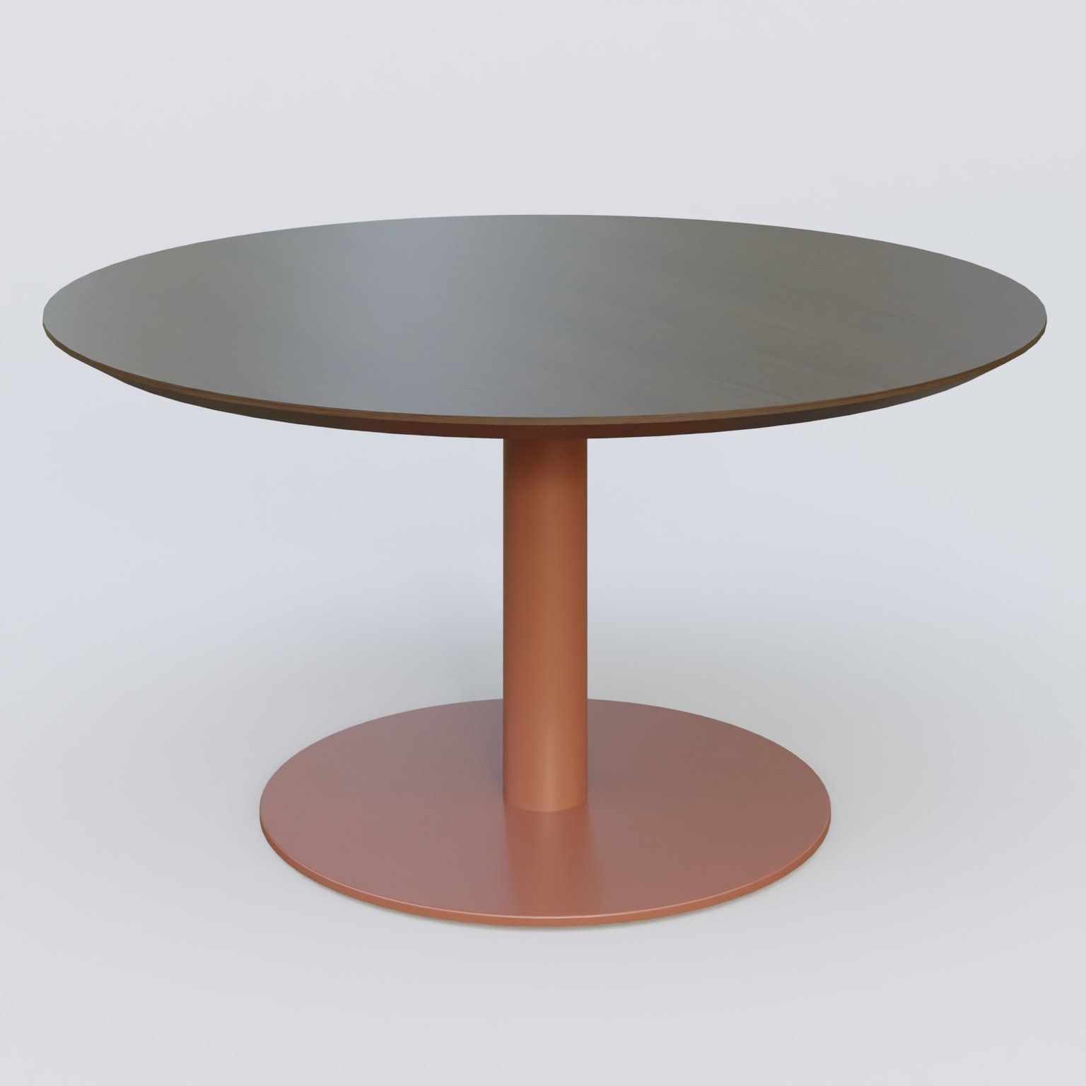 Table Basse Fashion Styl piètement colonne en métal et plateau bois. Plateau Chêne Moka et pietement Brun cuivré (RAL 8004).