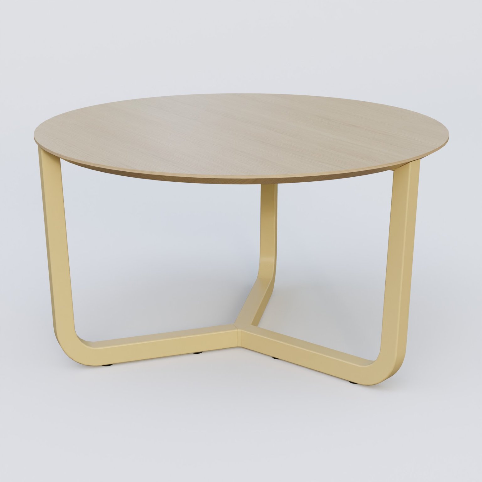 Table Basse Fashion Styl piètement tryptique en métal et plateau bois. Plateau Chêne et pietement Jaune Cuivre (RAL 1002).