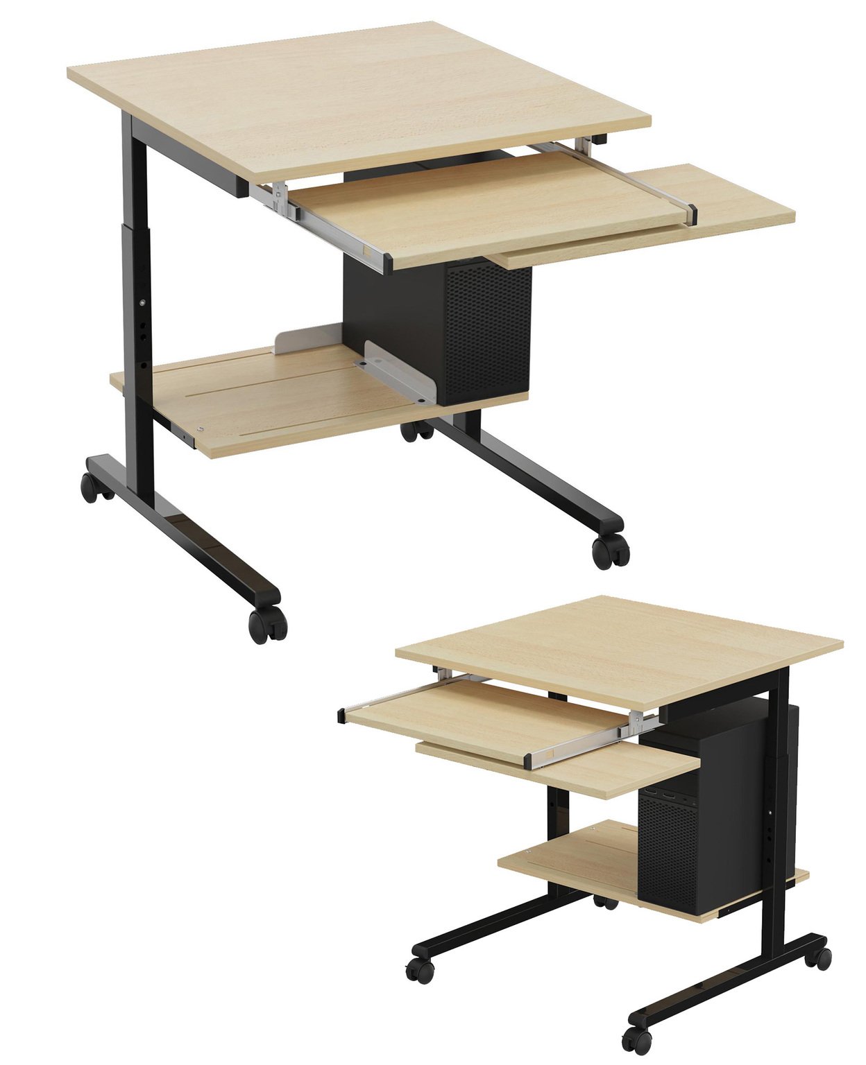 Poste informatique - 70 x 70 + Tablette support clavier sur coulisses métalliques. (roulettes) Plateau ép.19 mm mélaminé chant ABS de 2 mm - Plusieurs dimensions et coloris disponibles. Merci de prendre contact pour plus d'informations.