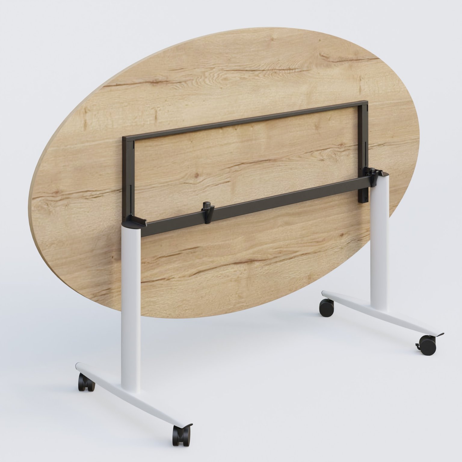 Table ovale abattante gamme Design 200-110 cm avec plateau en 25 mm d'épaisseur. Mécanisme de blocage/déblocage avec poignée toute longueur.