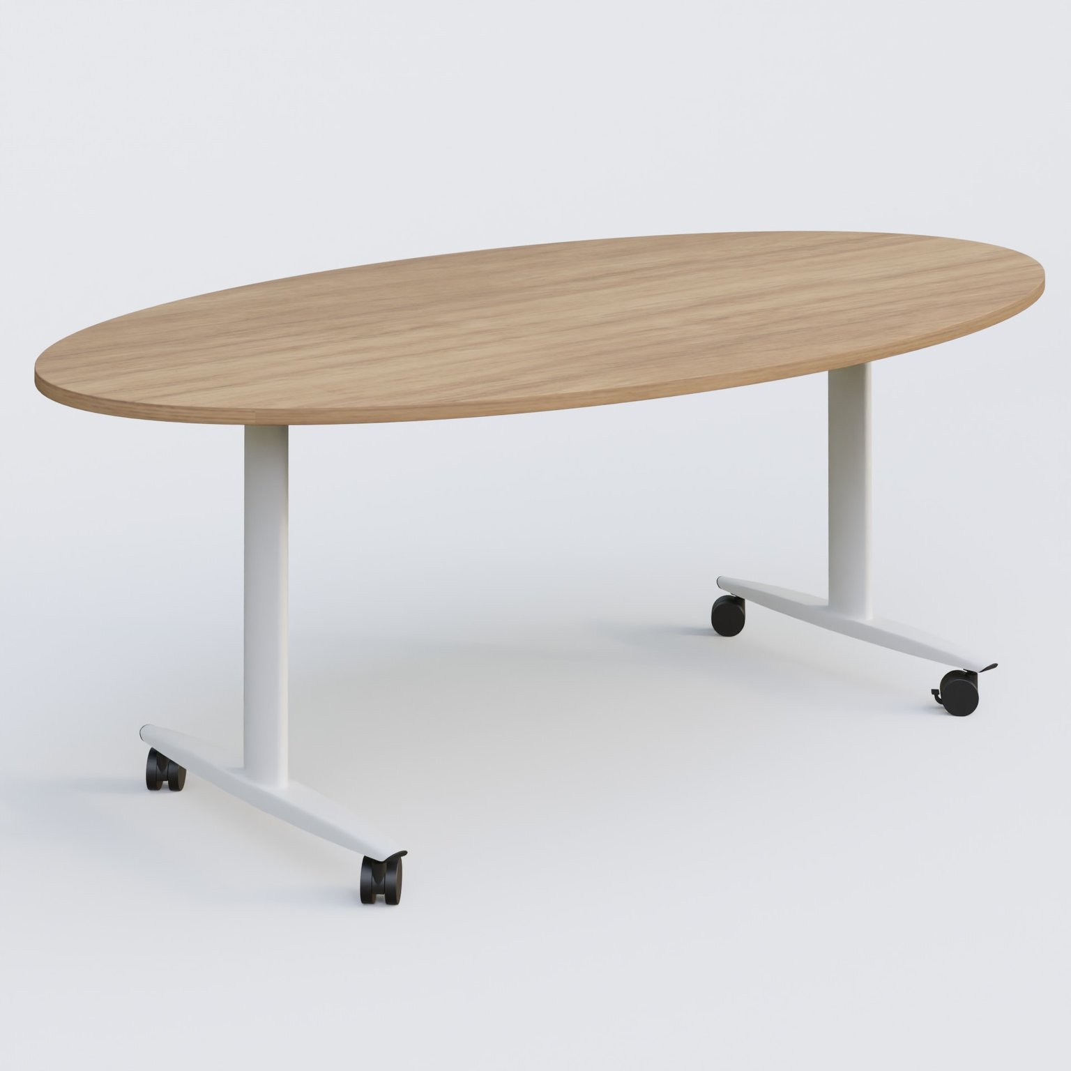 Table ovale abattante gamme Design 200-110 cm avec plateau en 25 mm d'épaisseur. Mécanisme de blocage/déblocage avec poignée toute longueur.