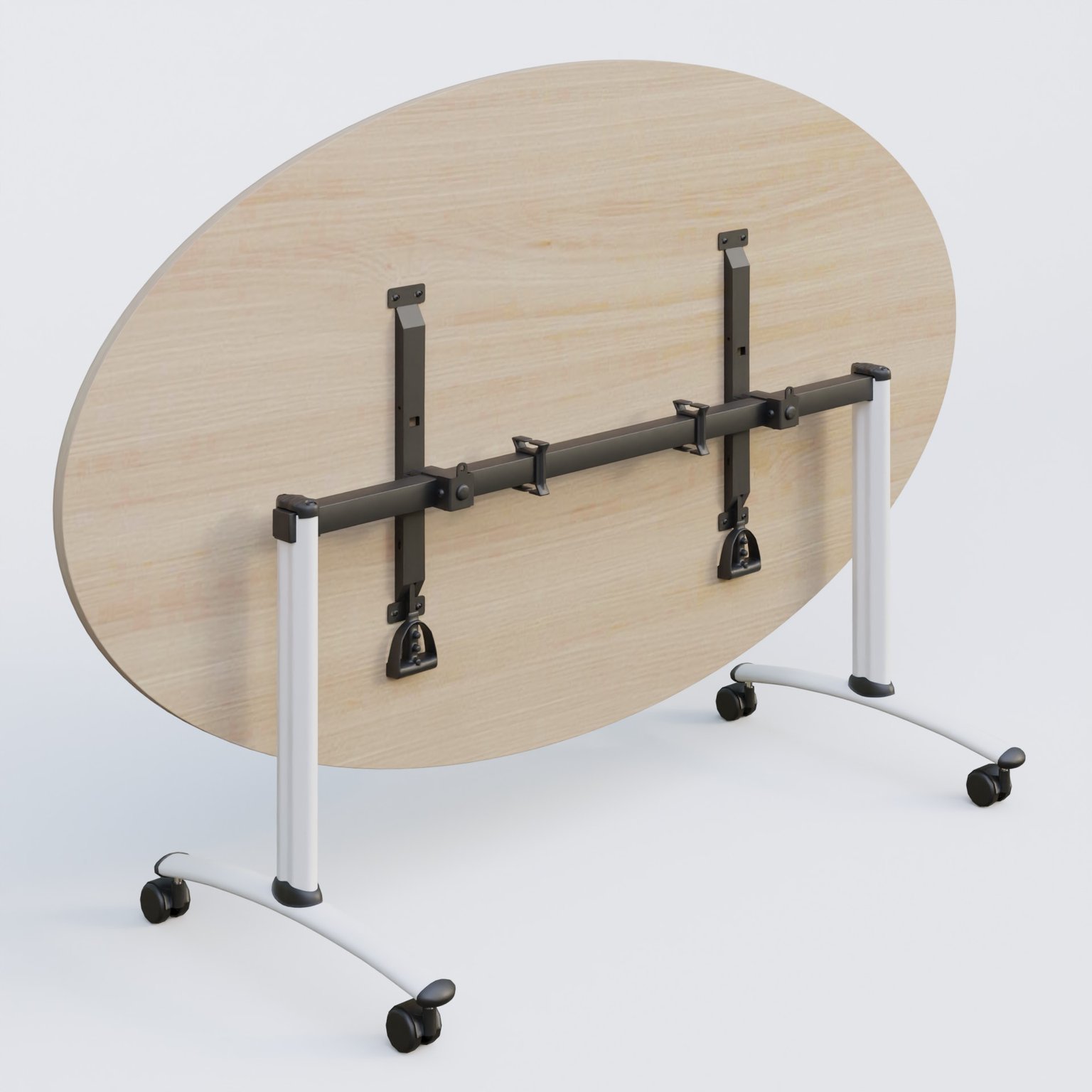 Table ovale gamme Arca 200-110 cm cm avec plateau en 25 mm d'épaisseur. Mécanisme de blocage/déblocage avec deux poignées sous le plateau aisémant accessibles.