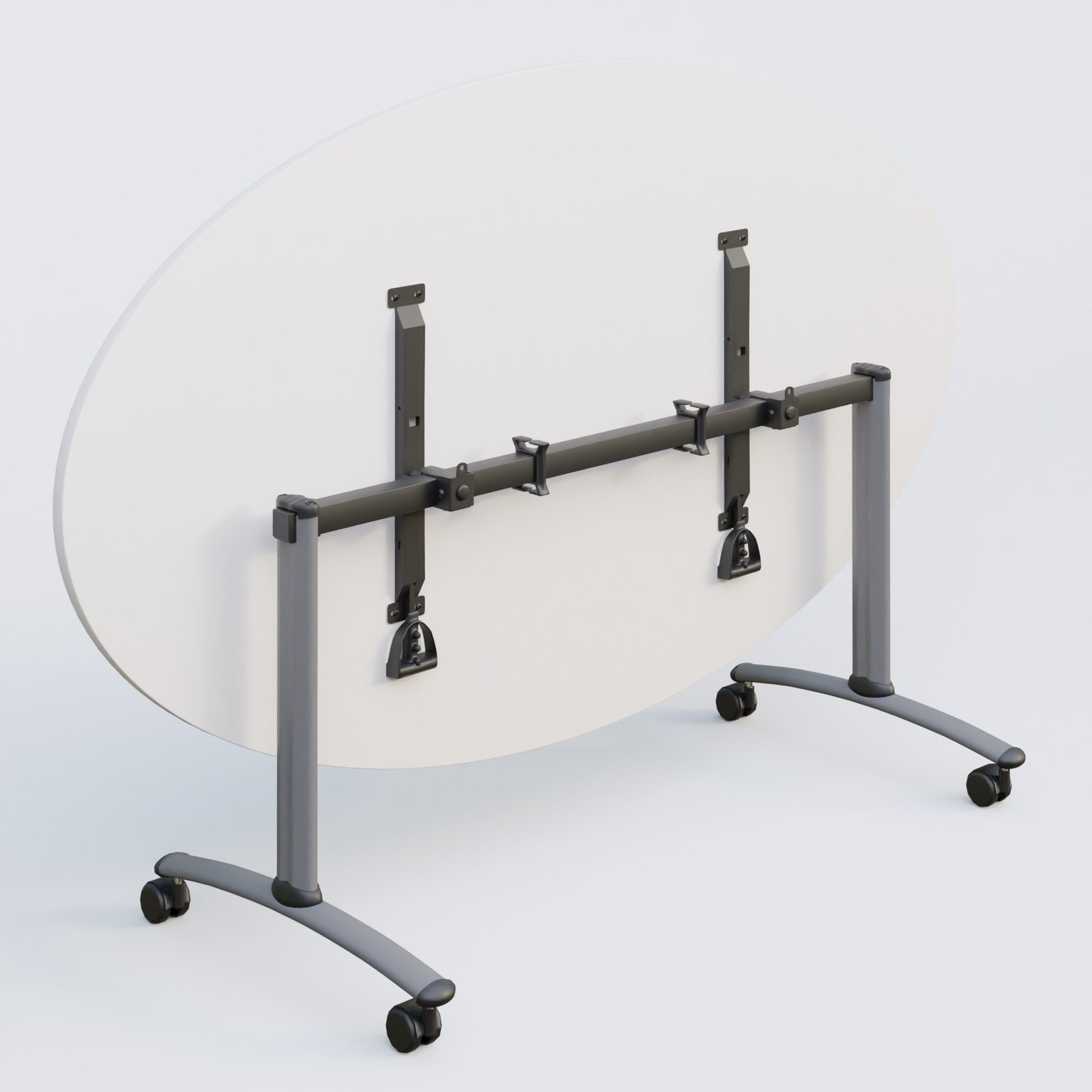 Table ovale gamme Arca 200-110 cm cm avec plateau en 25 mm d'épaisseur. Mécanisme de blocage/déblocage avec deux poignées sous le plateau aisémant accessibles.