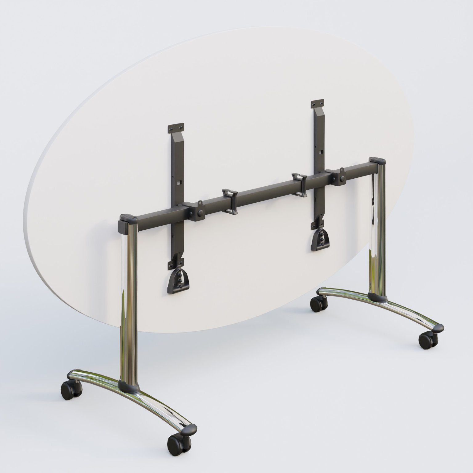 Table ovale gamme Arca 200-110 cm cm avec plateau en 25 mm d'épaisseur. Mécanisme de blocage/déblocage avec deux poignées sous le plateau aisémant accessibles.