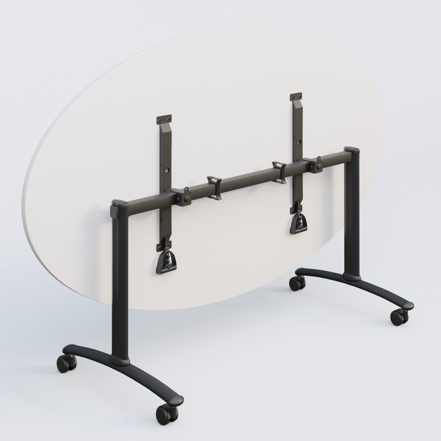 Table ovale gamme Arca 200-110 cm cm avec plateau en 25 mm d'épaisseur. Mécanisme de blocage/déblocage avec deux poignées sous le plateau aisémant accessibles.