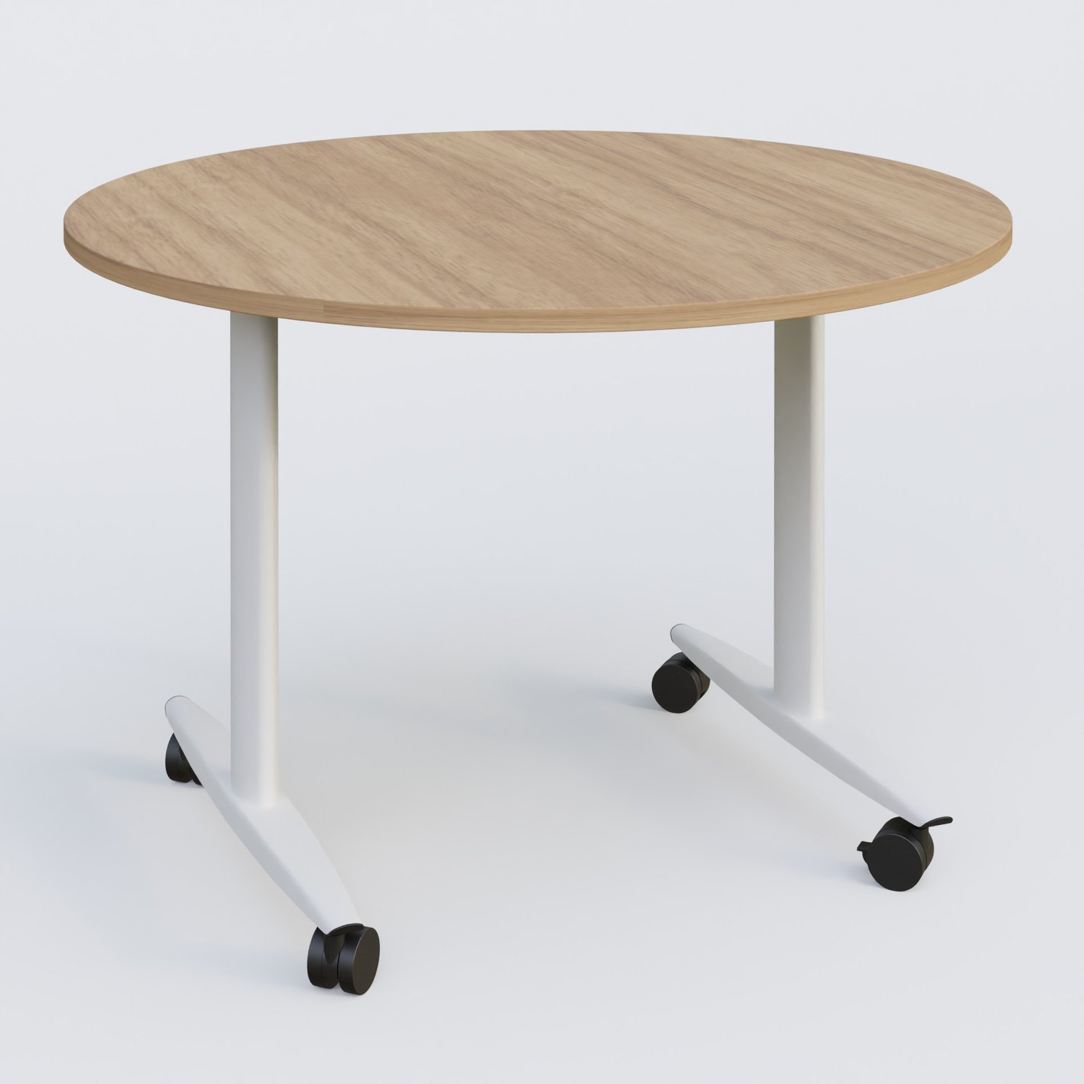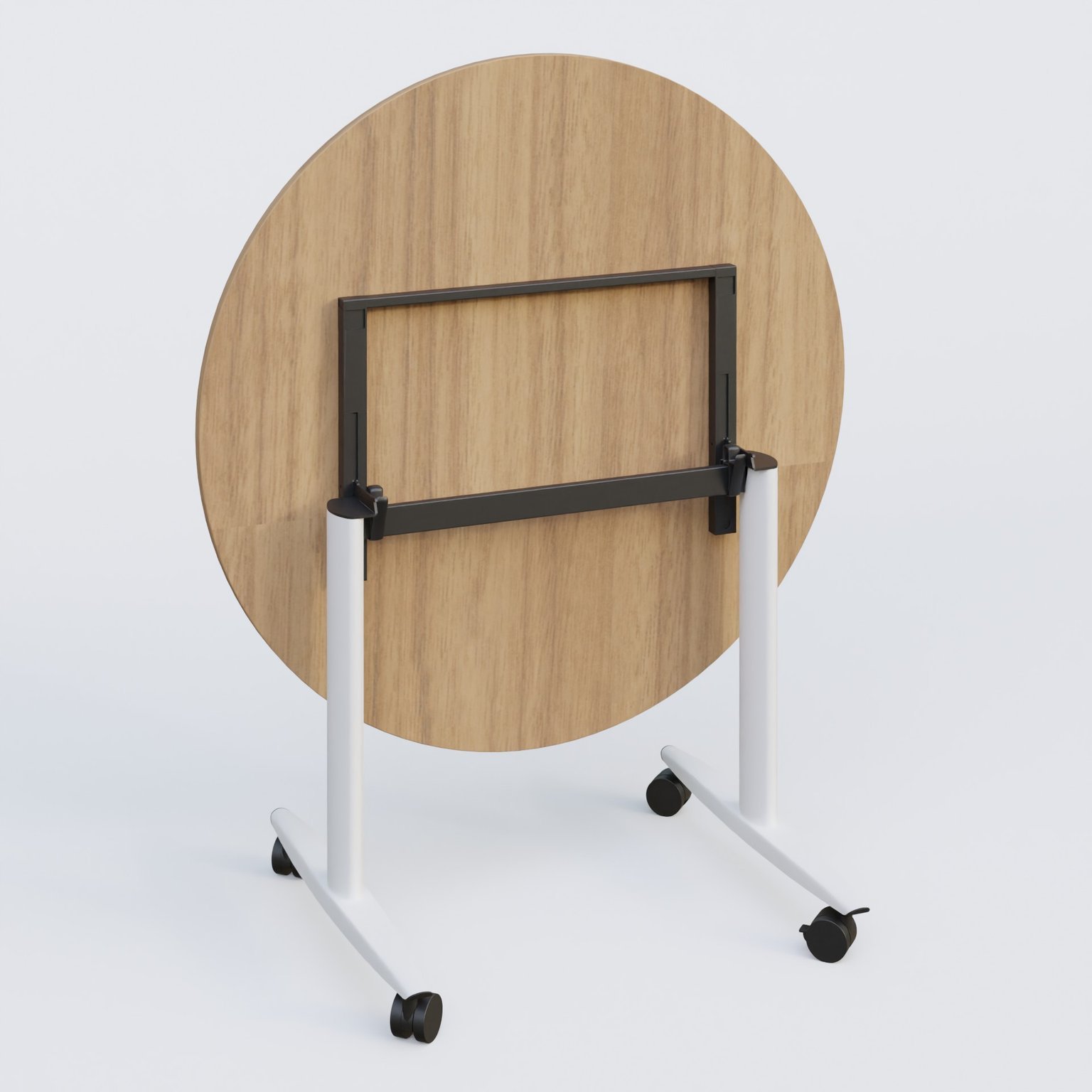 Table ronde abattante gamme Design D110 cm avec plateau en 25 mm d'épaisseur. Mécanisme de blocage/déblocage avec poignée toute longueur.