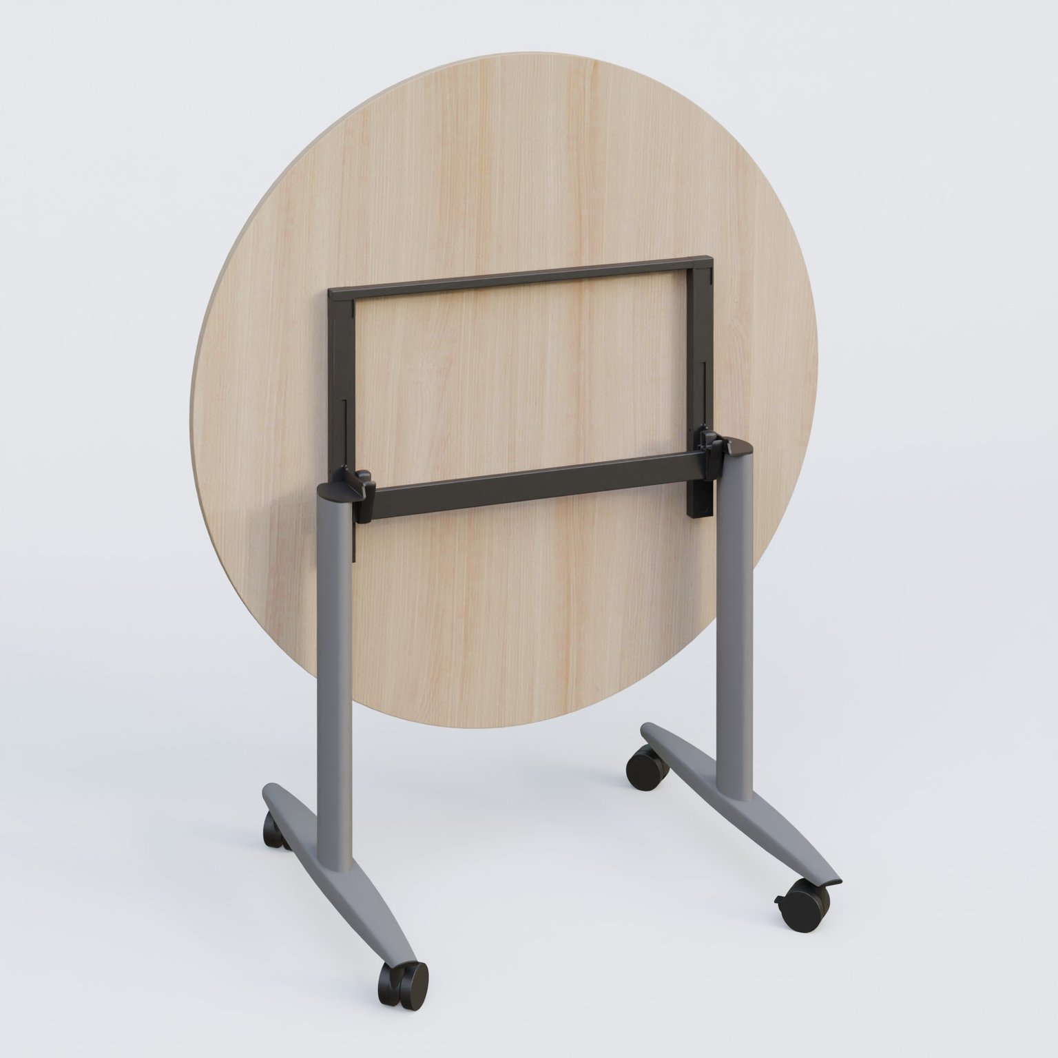 Table ronde abattante gamme Design D110 cm avec plateau en 25 mm d'épaisseur. Mécanisme de blocage/déblocage avec poignée toute longueur.
