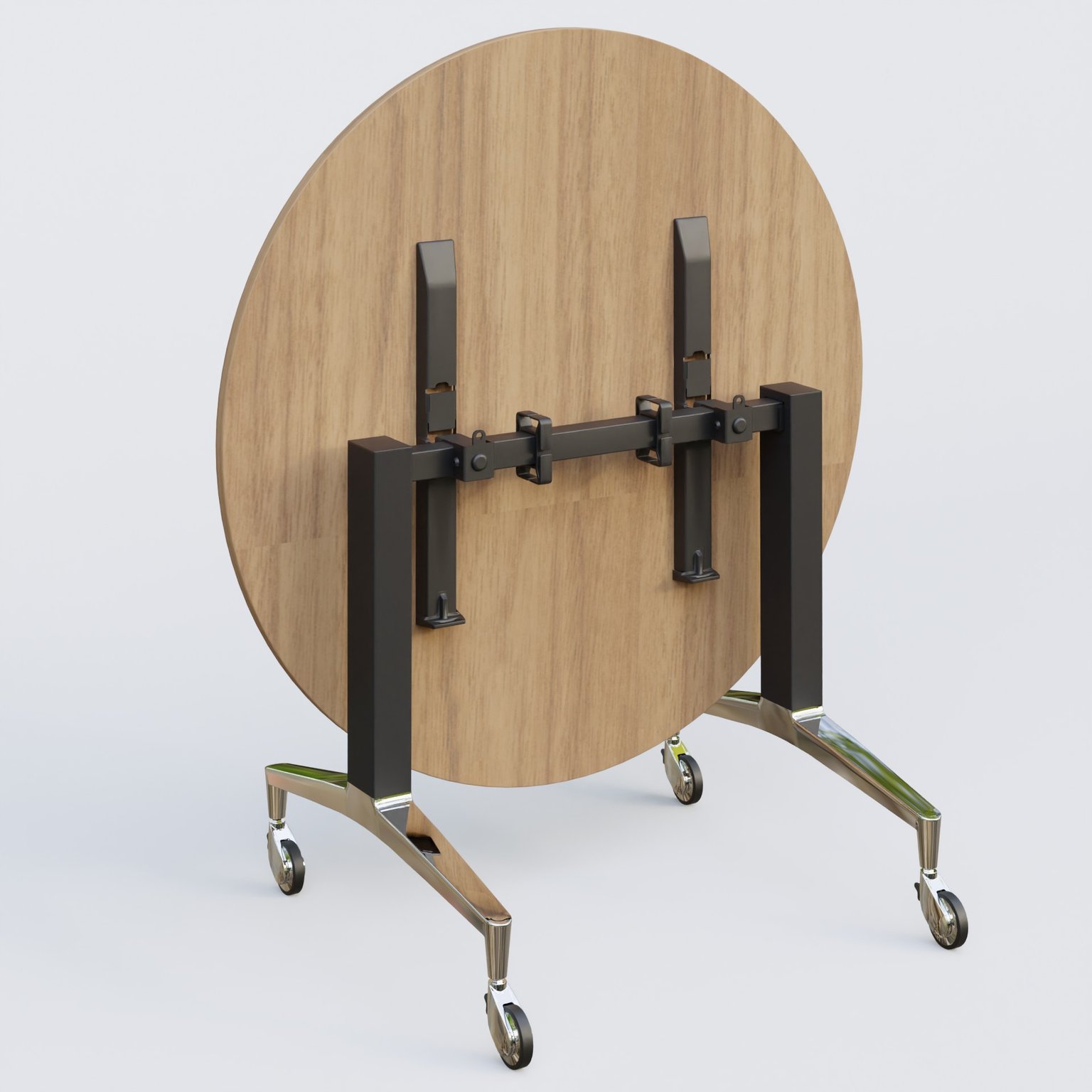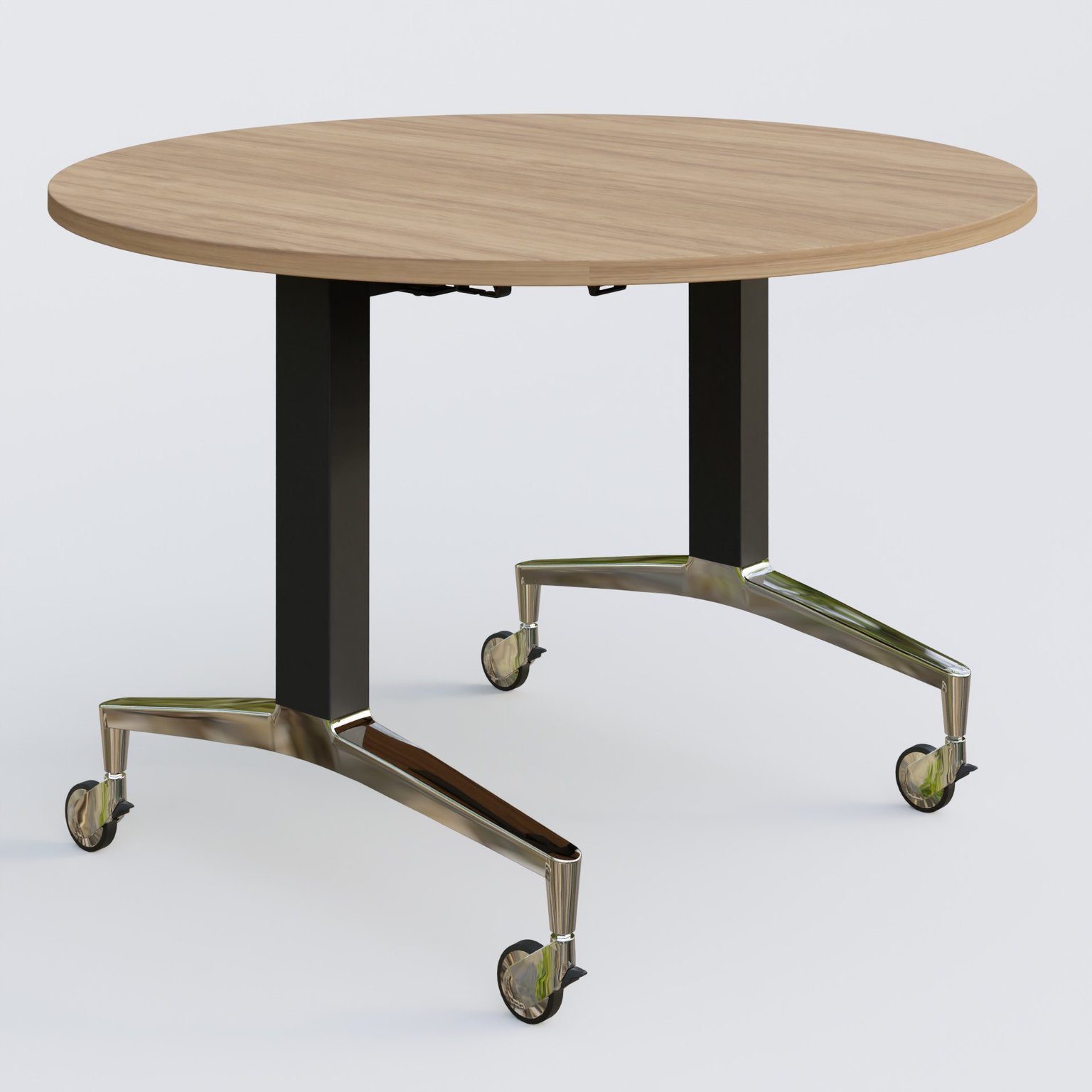 Table ronde de la gamme LEM D110 cm avec plateau en 25 mm d'épaisseur. Mécanisme actionné par deux poignées facilement accéssibles sous le plateau.