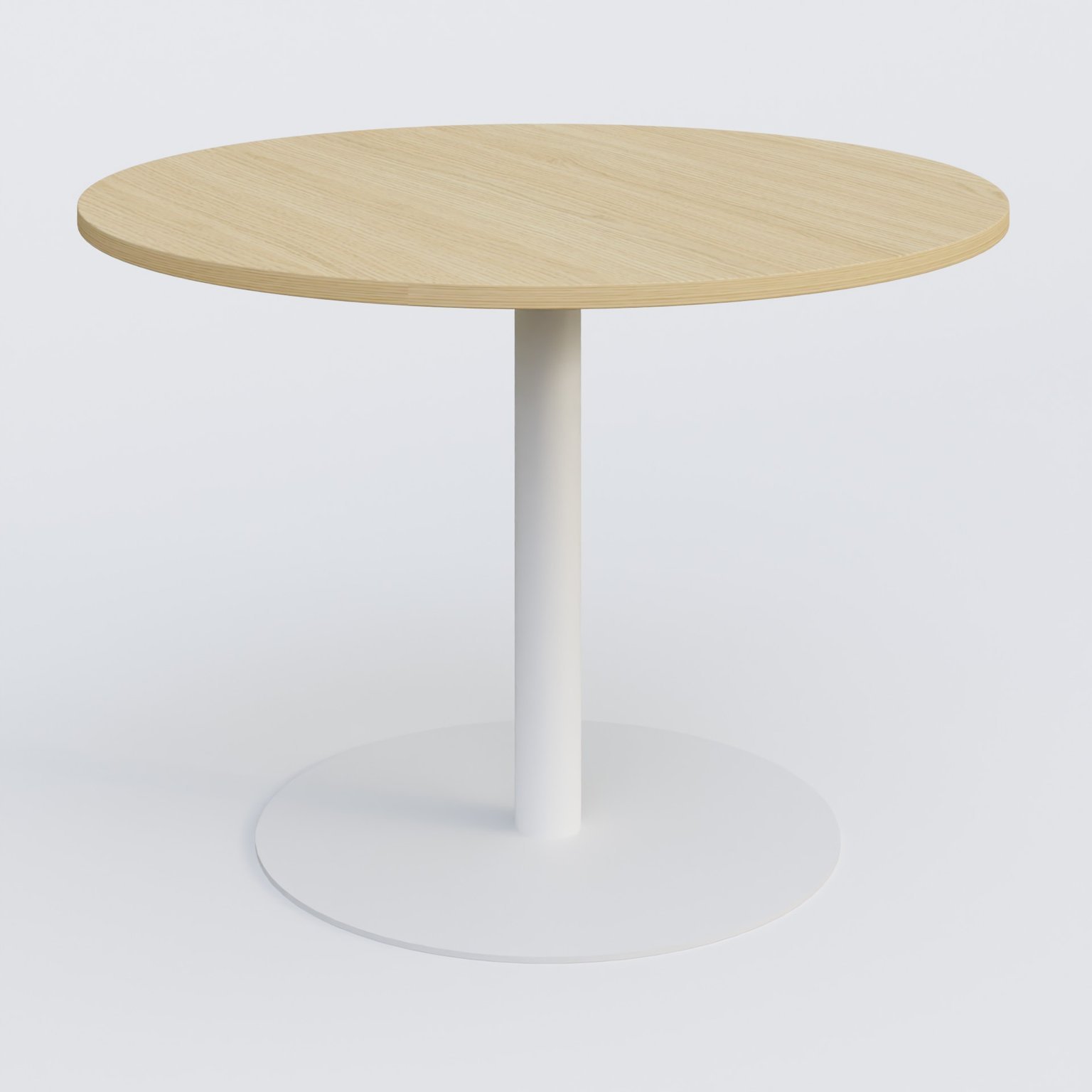 Table ronde diametre 110 cm avec pieds colonne centrale. Plateau Chêne clair et pietement Blanc