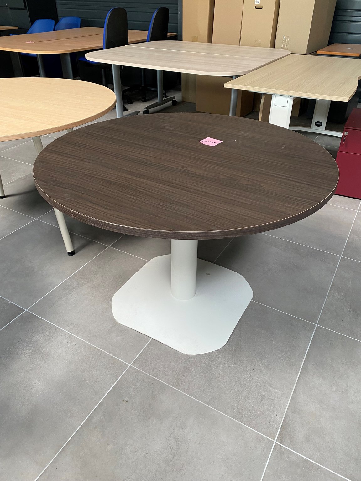 Table ronde diamètre 110 cm, plateau wengé pied central blc