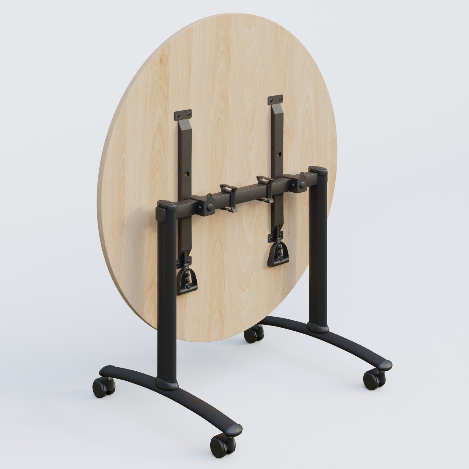 Table ronde gamme Arca D110 cm cm avec plateau en 25 mm d'épaisseur. Mécanisme de blocage/déblocage avec deux poignées sous le plateau aisémant accessibles.