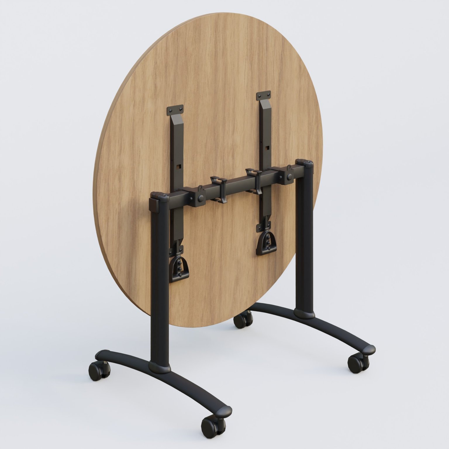 Table ronde gamme Arca D110 cm cm avec plateau en 25 mm d'épaisseur. Mécanisme de blocage/déblocage avec deux poignées sous le plateau aisémant accessibles.