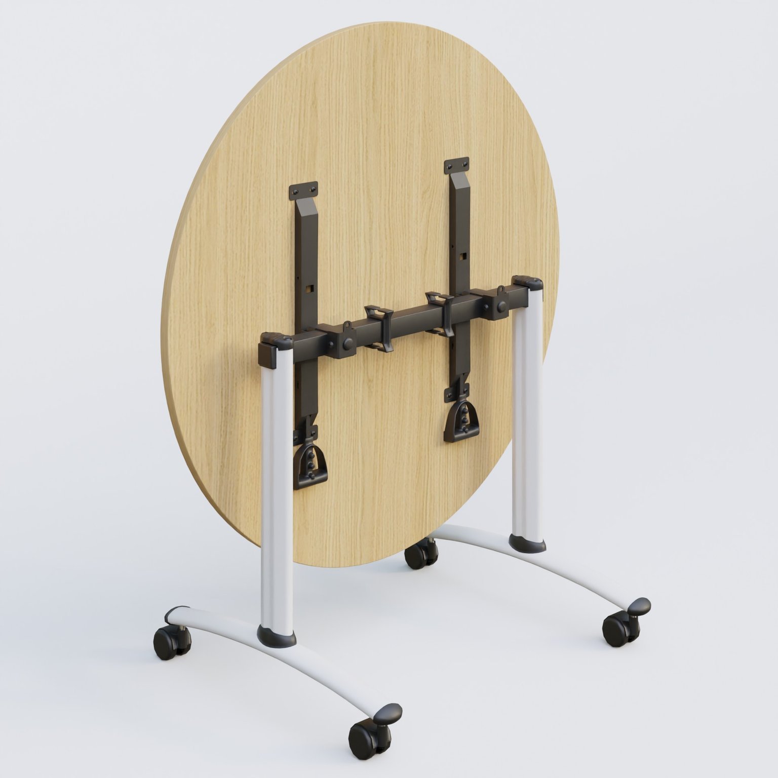 Table ronde gamme Arca D110 cm cm avec plateau en 25 mm d'épaisseur. Mécanisme de blocage/déblocage avec deux poignées sous le plateau aisémant accessibles.