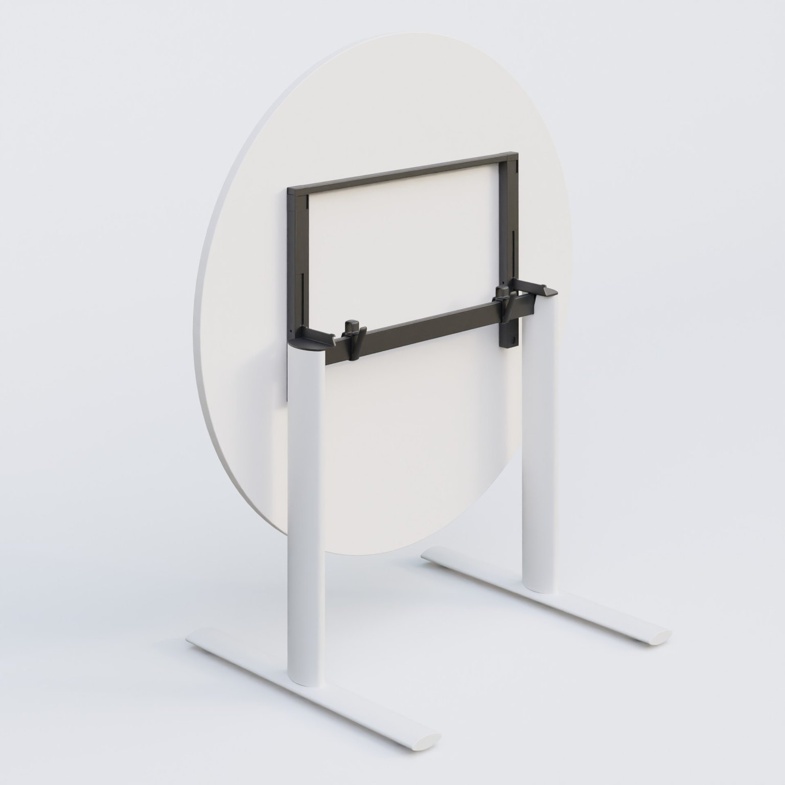 Table ronde gamme Pure diametre 110 cm avec plateau en 25 mm d'épaisseur. Mécanisme de blocage/déblocage avec une barre sous le plateau.