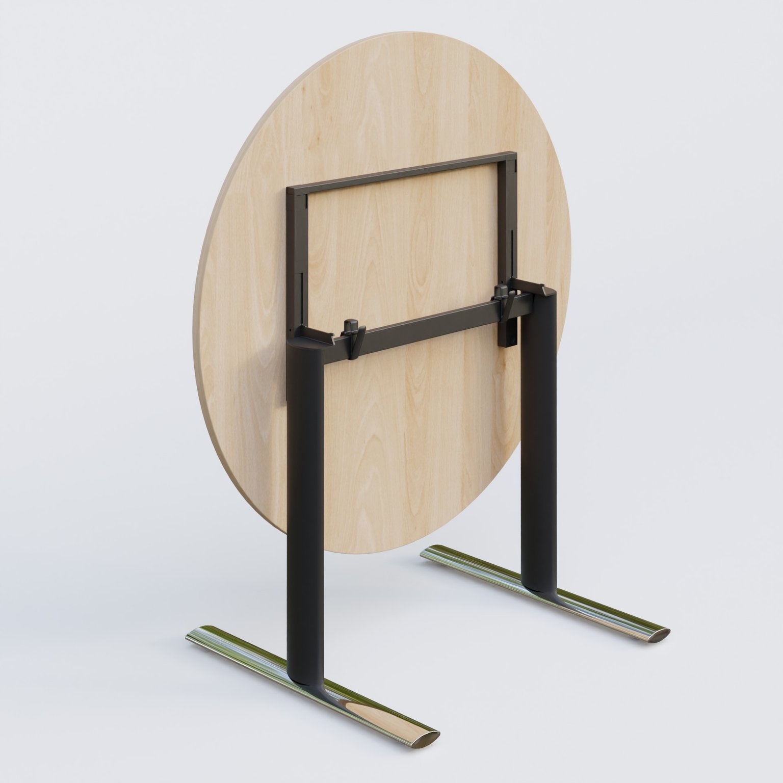 Table ronde gamme Pure diametre 110 cm avec plateau en 25 mm d'épaisseur. Mécanisme de blocage/déblocage avec une barre sous le plateau.