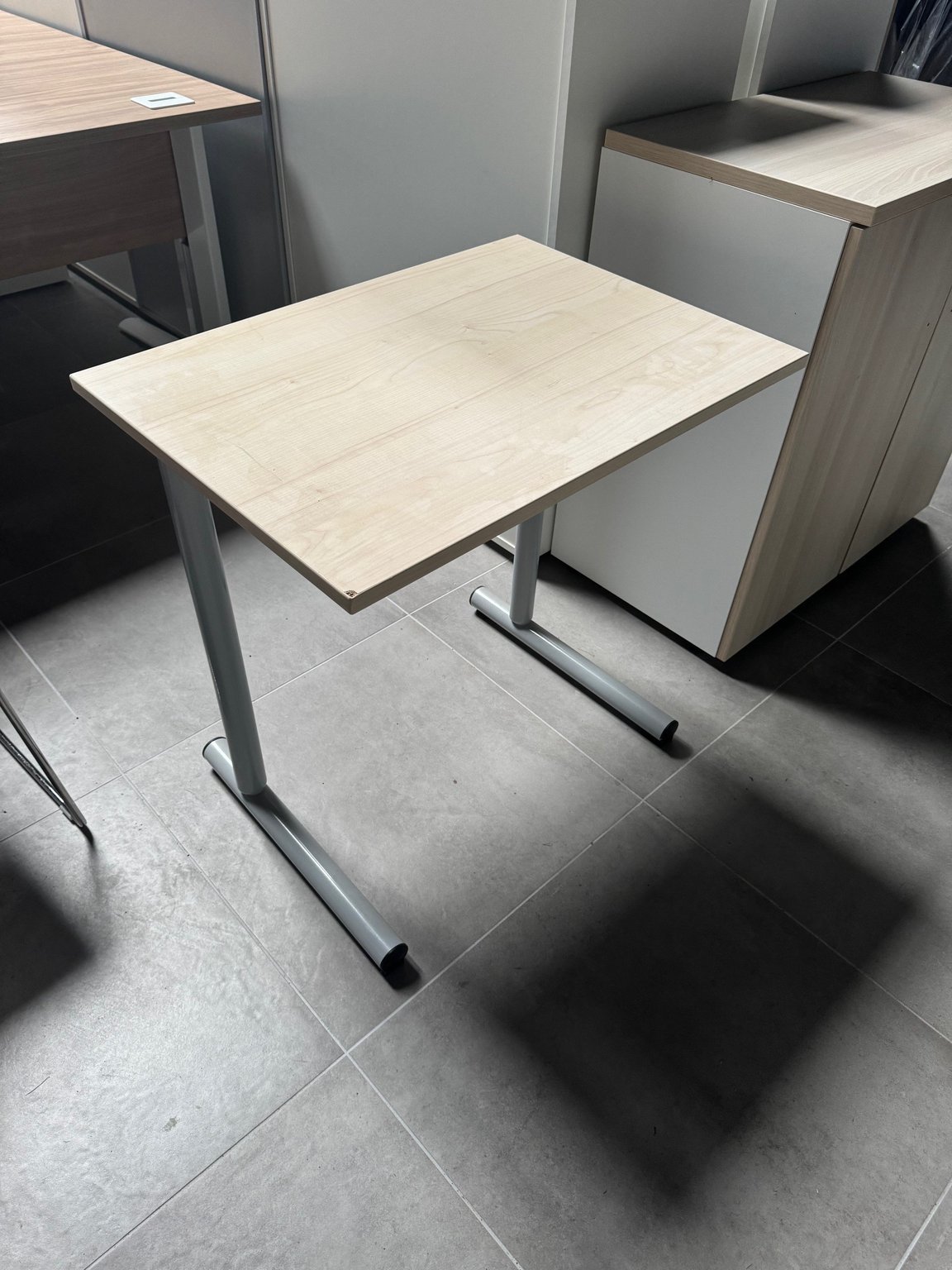 - Table scolaire 70 x 50 cm, plateau acacia abîmé dans un angle, piétement métal couleur gris