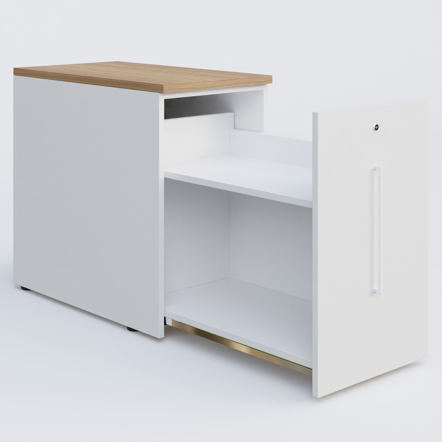 Tour de rangement hauteur de bureau 72 cm position à droite. Caisson Noyer et top de finition Blanc.