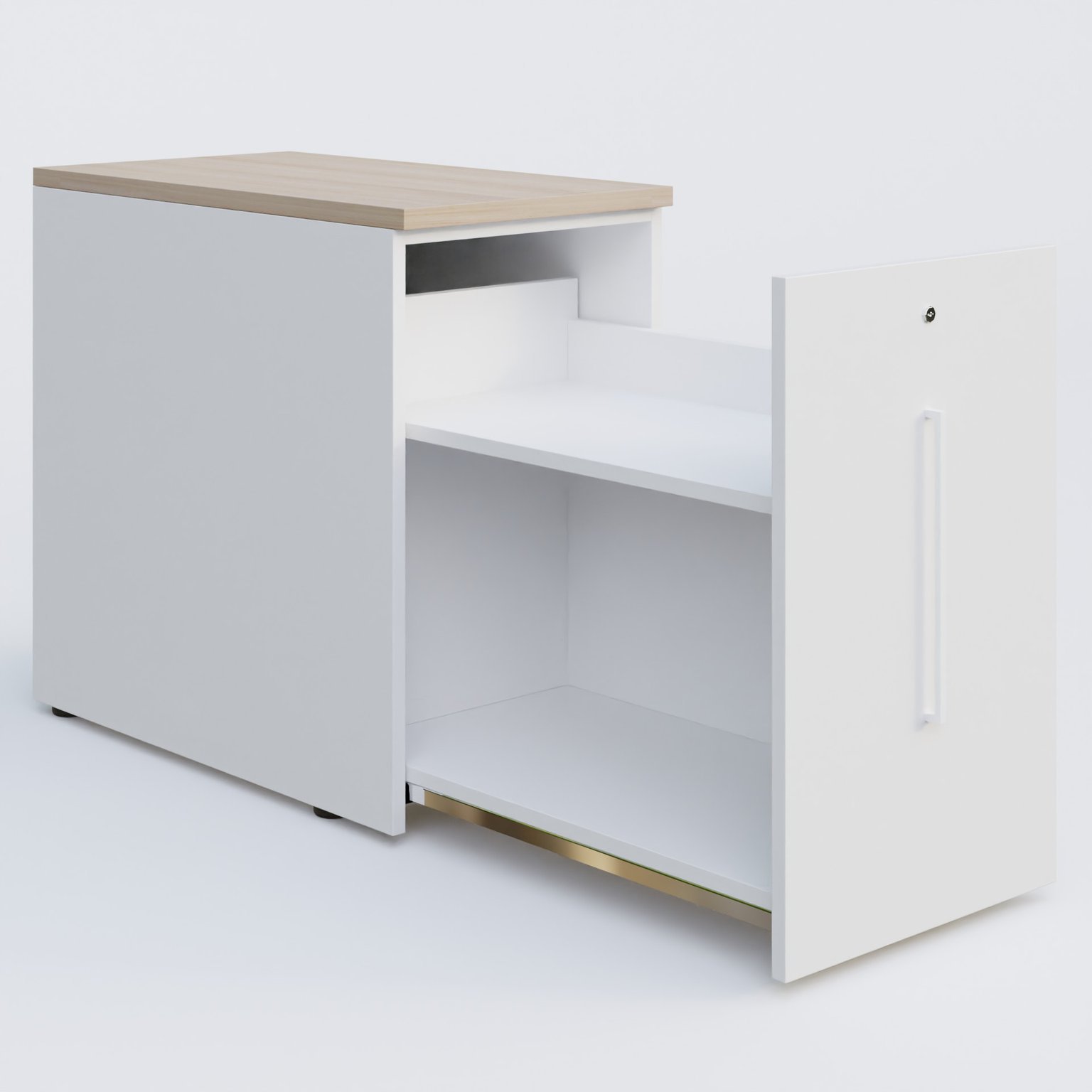 Tour de rangement hauteur de bureau 72 cm position à droite. Caisson Chêne clair et top de finition Blanc. cheneCe