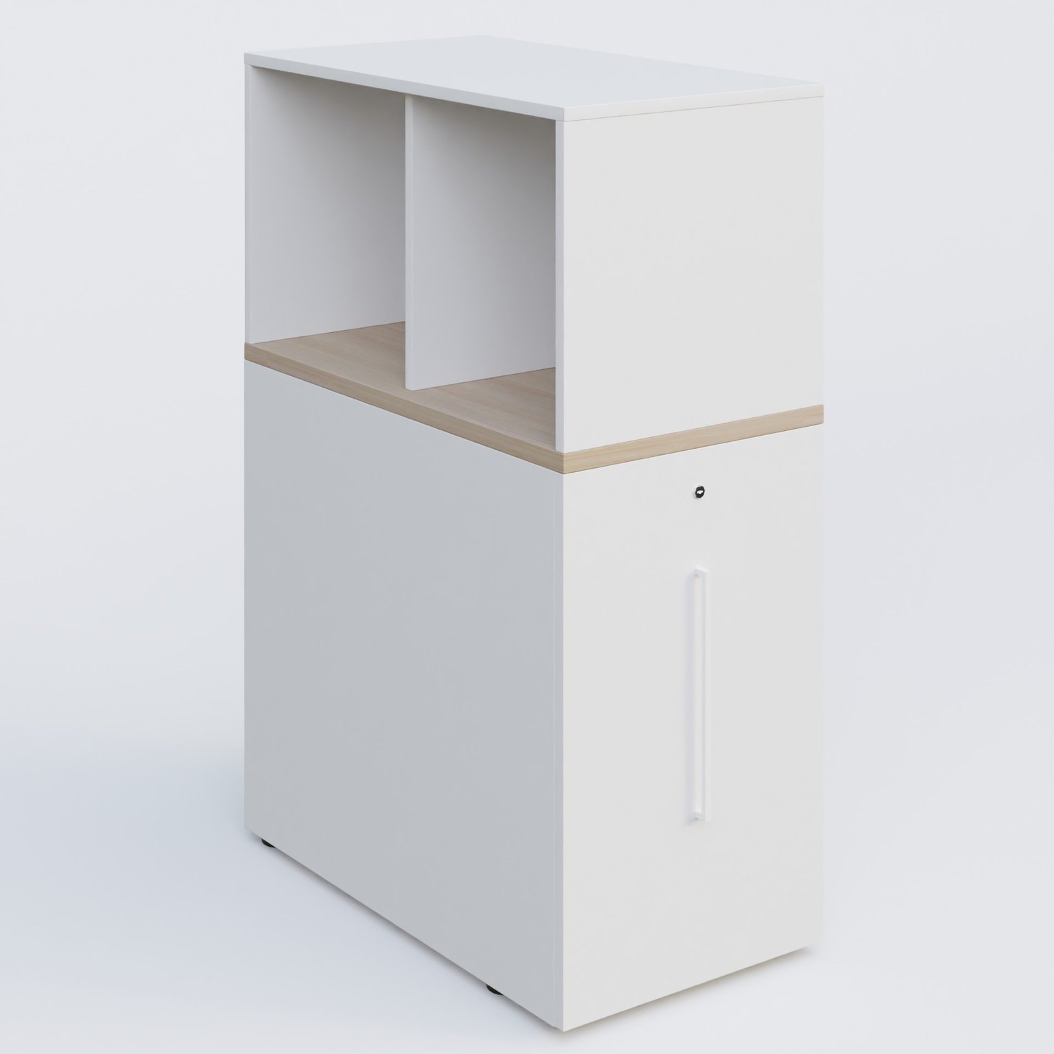 Tour de rangement hauteur de bureau position à droite avec Niche. Caisson Hêtre et top de finition Blanc. hetreHe