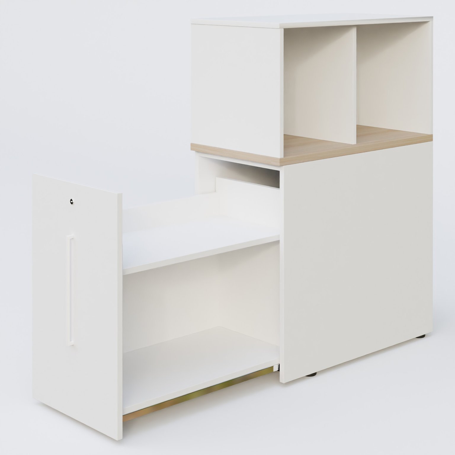 Tour de rangement hauteur de bureau position à gauche avec Niche. Caisson Hêtre et top de finition Blanc. hetreHe