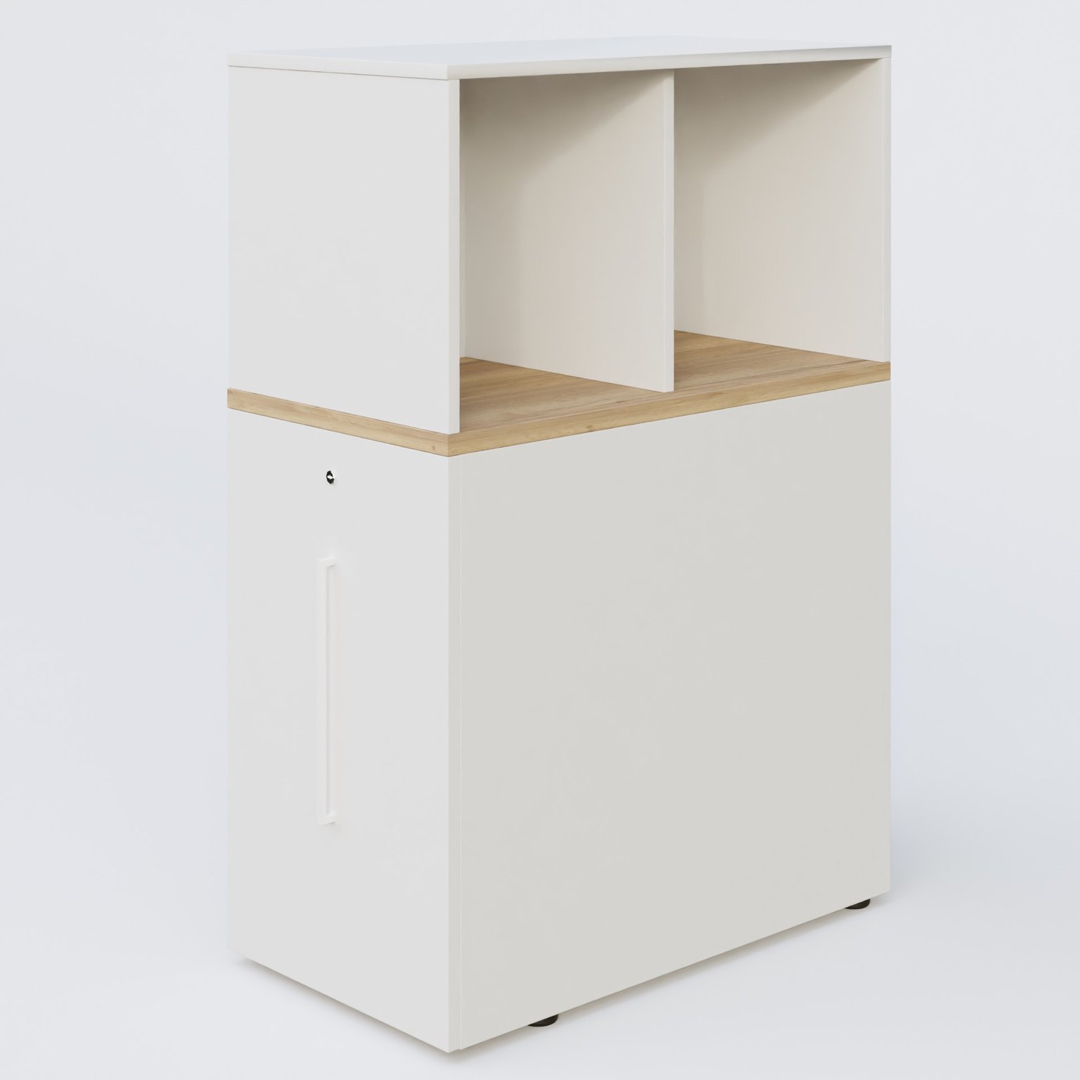 Tour de rangement hauteur de bureau position à gauche avec Niche. Caisson Chêne naturel et top de finition Blanc.