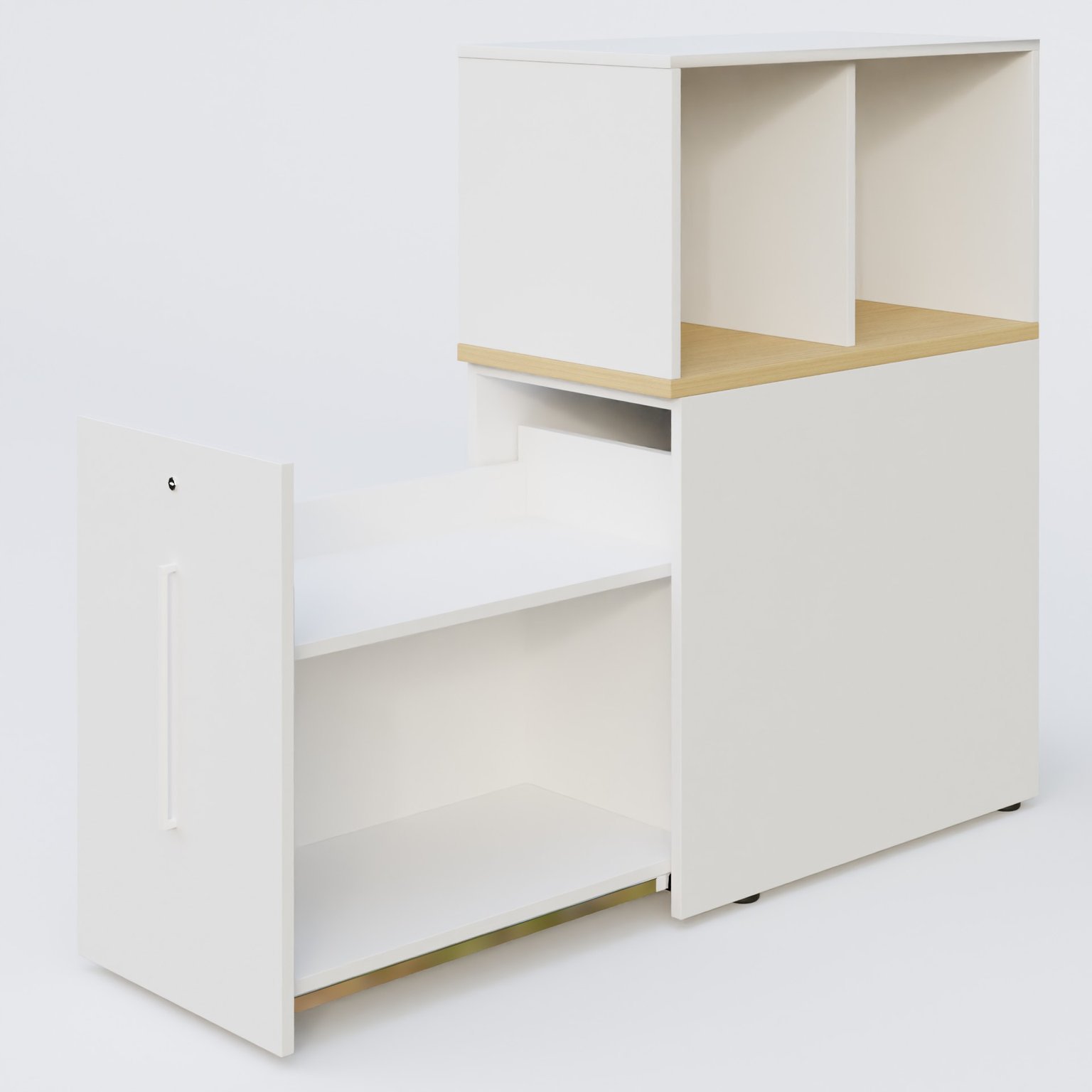 Tour de rangement hauteur de bureau position à gauche avec Niche. Caisson Chêne naturel et top de finition Blanc. cheneNaturelMh84