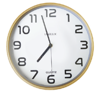 - WOODY 3 pendule éco-conçue, structure en bois, diamètre 30,5cm, lisible à 35m, fond blanc, cadre hêtre naturel