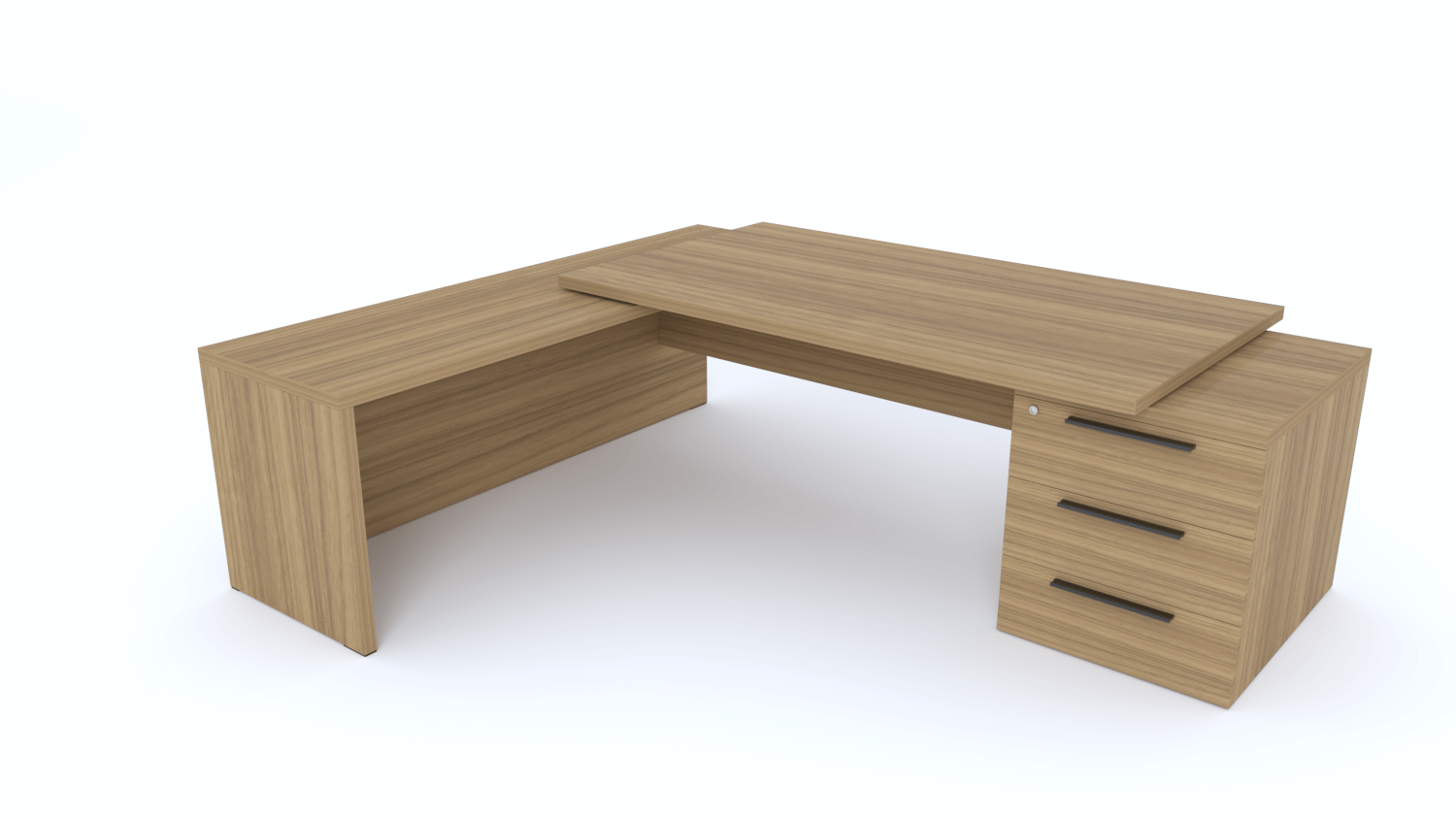 X5 Ensemble de bureau 230x200cm : table 180x90cm avec retour mur et caisson débordant 60x200cm /noyer poignées noires