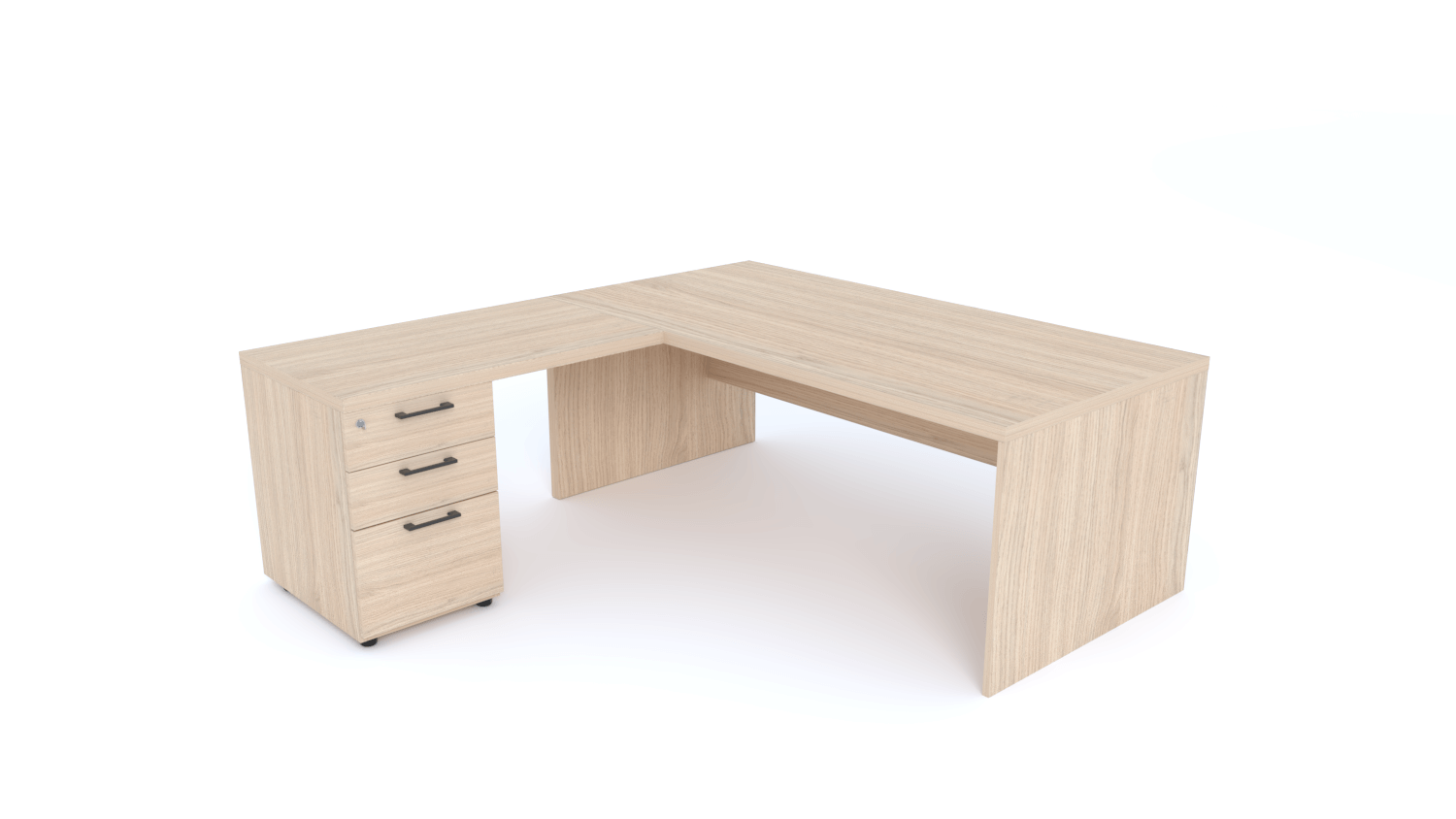 - X5- Plan Manager 180x90cm avec retour 100x60cm sur caisson hauteur bureau 3 tiroirs (encombrement 180x190cm) -Finitions = Plateau : Chêne (CE) / Caisson : Chêne (CE) / Piètements : Chêne (CE), poignées noires
