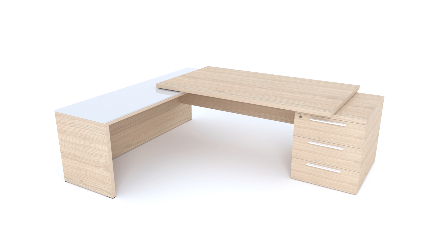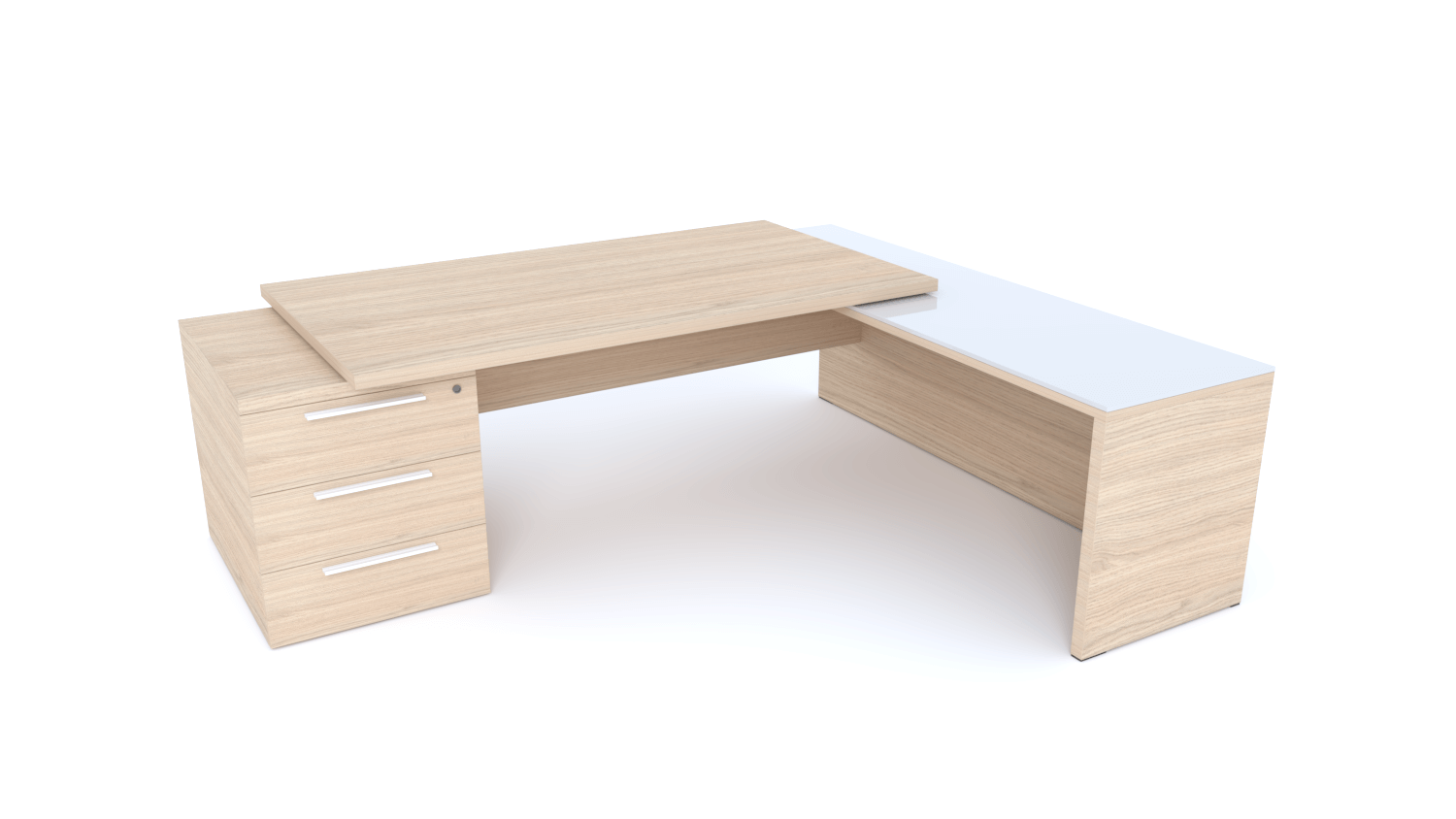 X5- Plan Manager 180x90cm sur caisson XXL 3 tiroirs avec retour mur débordant top verre (encombrement 236x200cm) -Finitions = Plateau : Chêne (CE) /Plateau : Verre (VB)/ Caisson: Chêne (CE), Poignées blanches