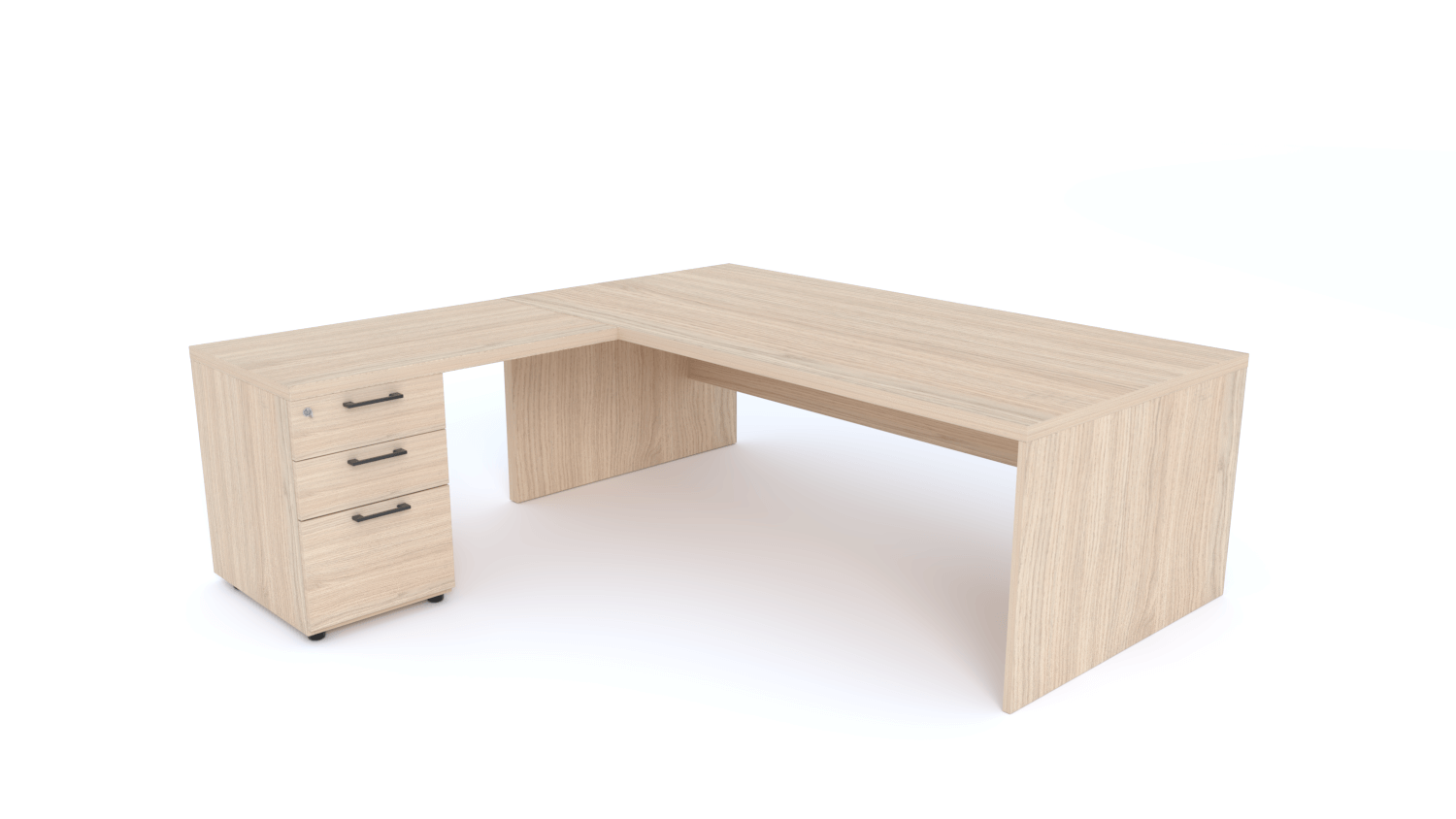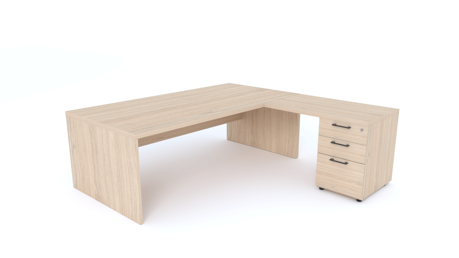 - X5- Plan Manager 200x100cm avec retour 100x60cm sur caisson hauteur bureau 3 tiroirs (encombrement 200x200cm) -Finitions = Plateau : Chêne (CE) / Caisson : Chêne (CE) / Piètements : Chêne (CE), poignées noires